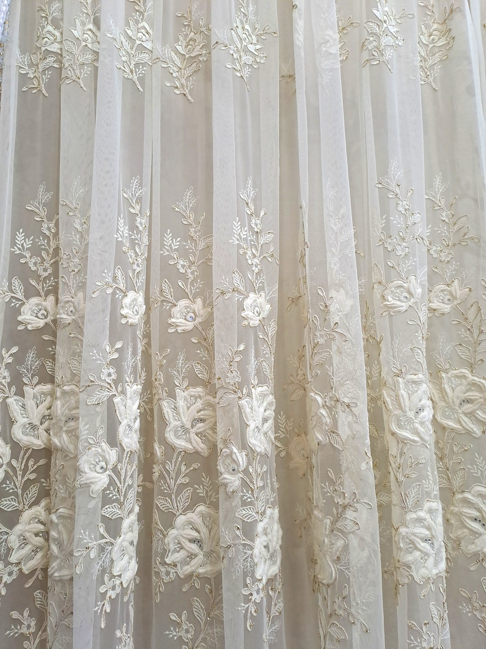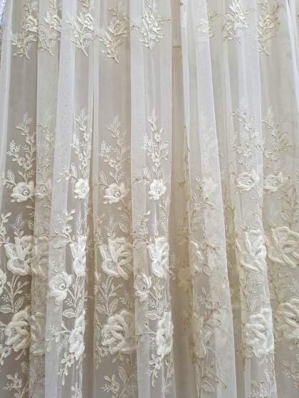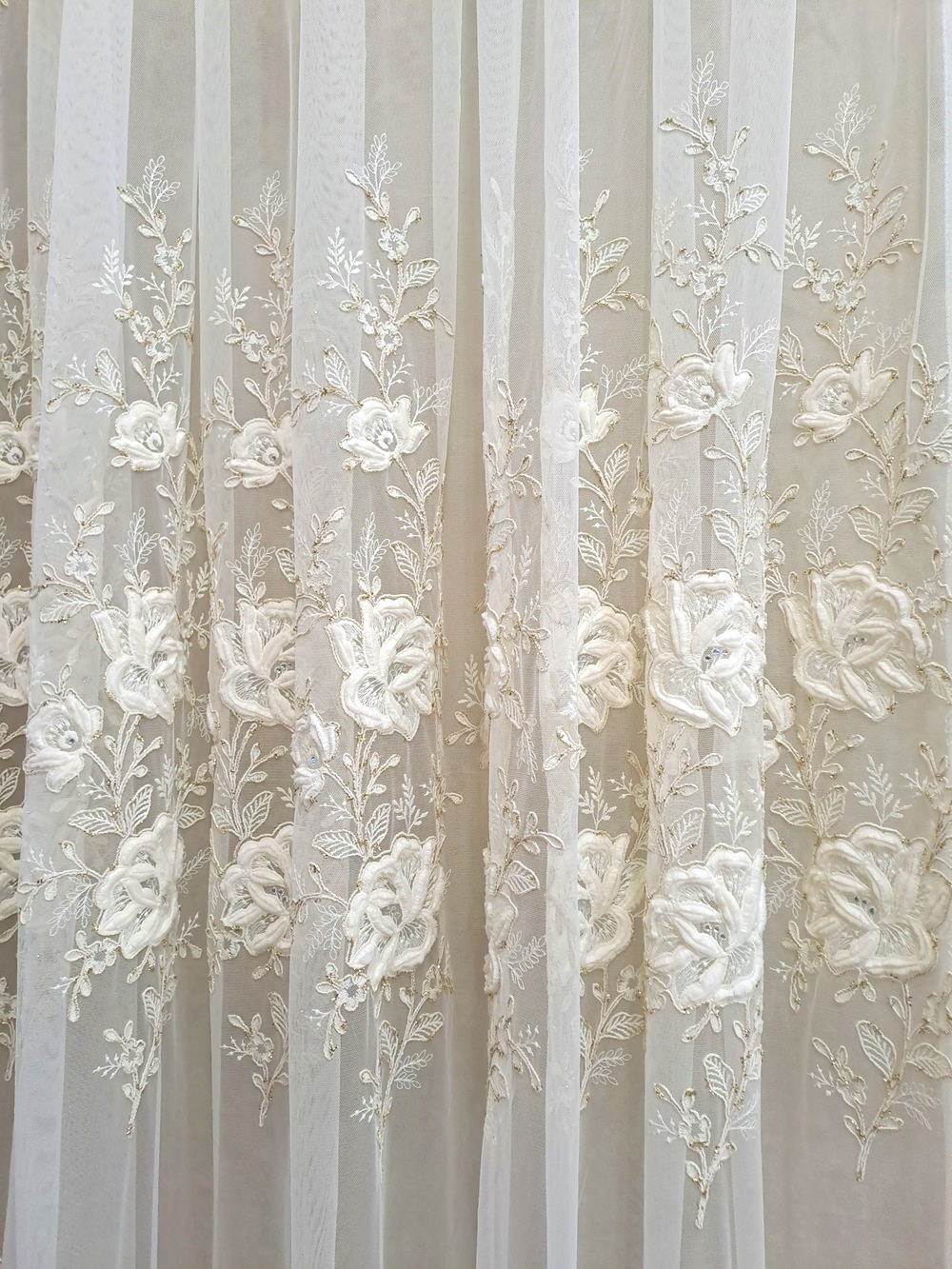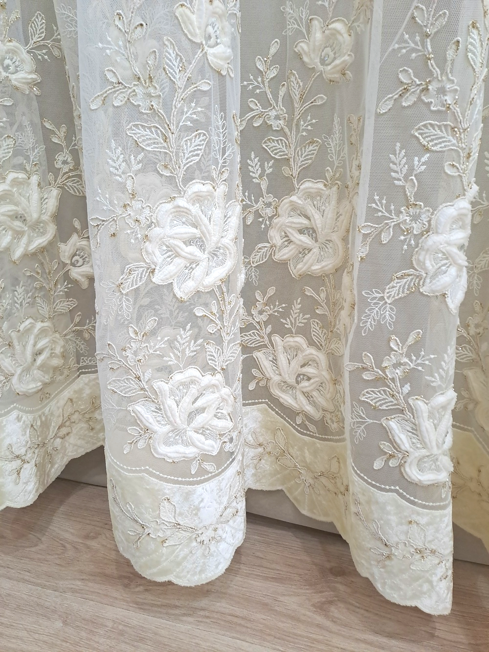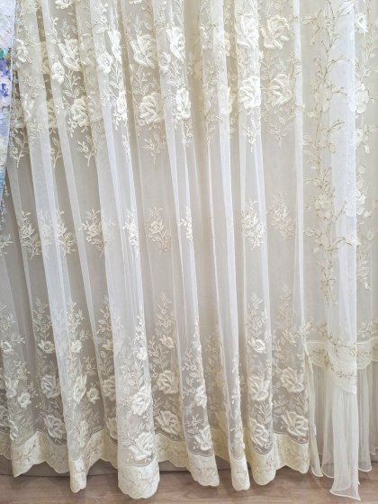 Este o perdea ivoar pe suport de tull brodată cu trandafiri ieșiți ușor în relief. Are aplicații de cristale. În partea marginală are colțișori din catifea crem. Modelul este dispus în borduri orizontale pe înălțime.
