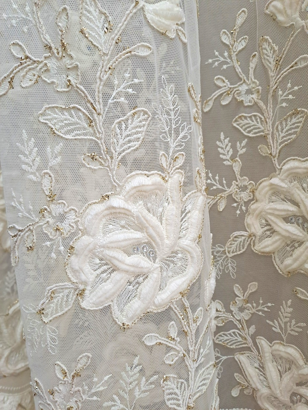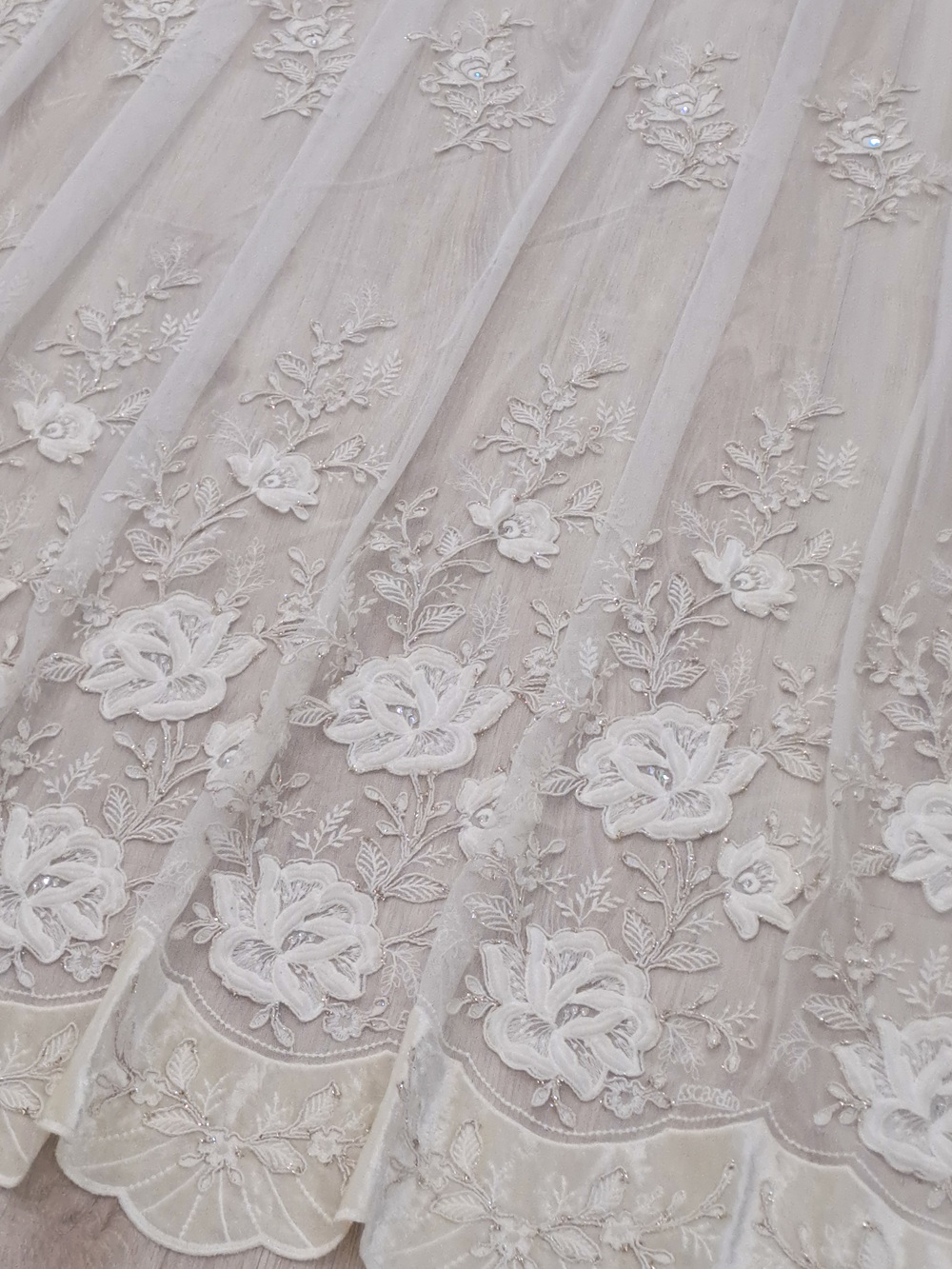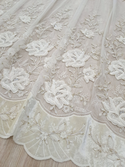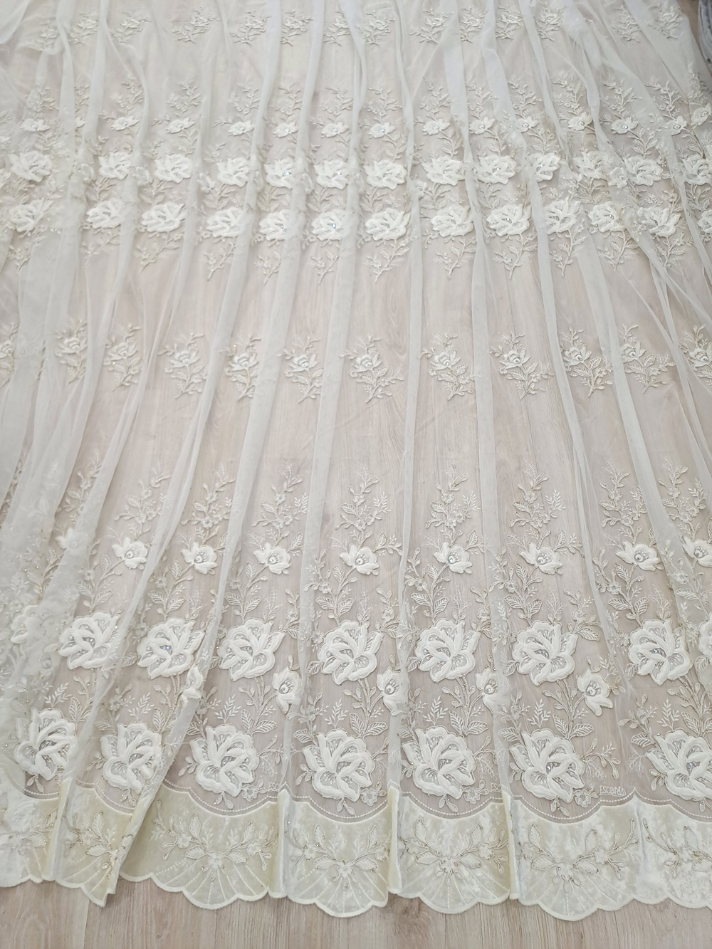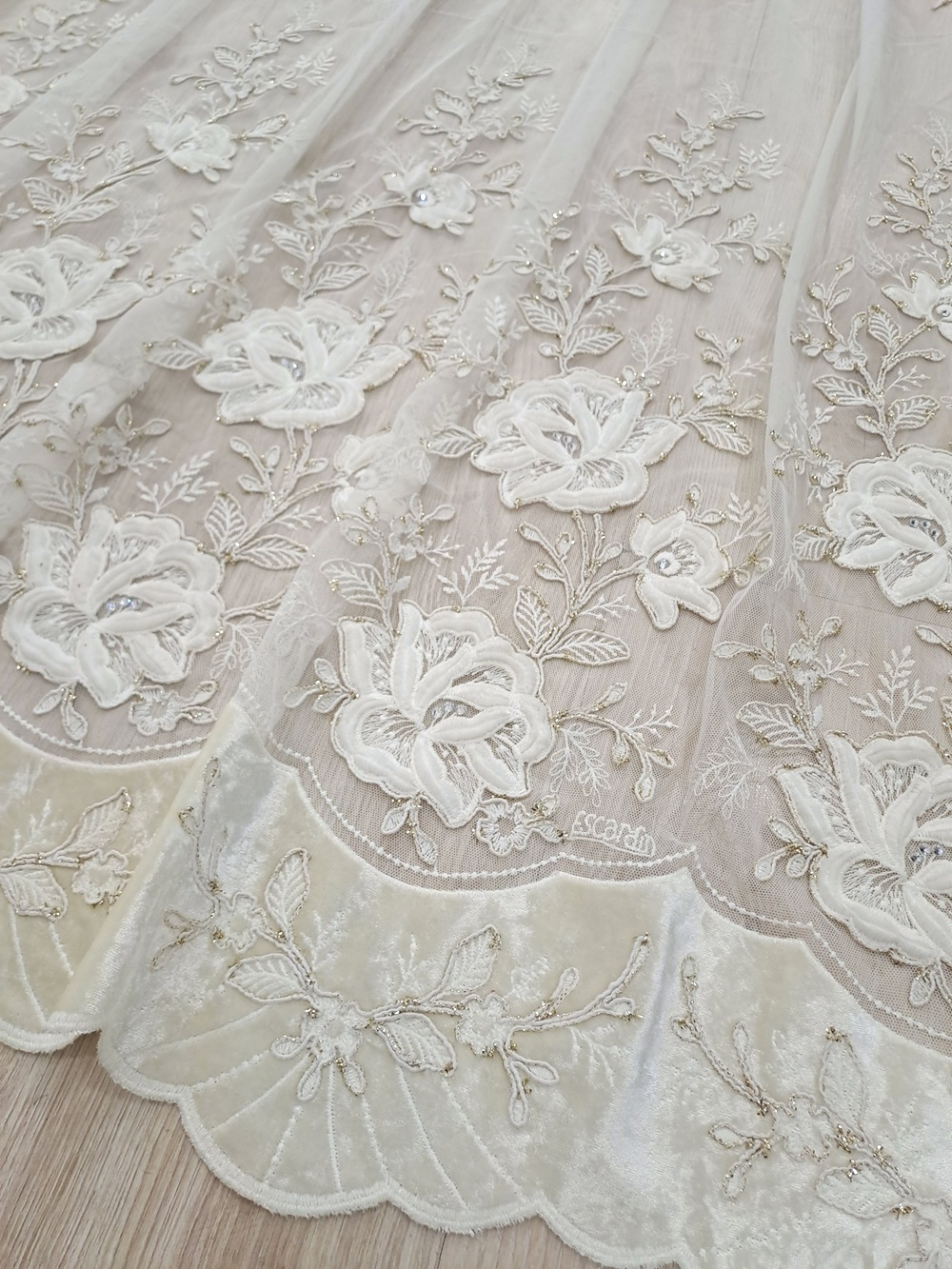 Este o perdea ivoar pe suport de tull brodată cu trandafiri ieșiți ușor în relief. Are aplicații de cristale. În partea marginală are colțișori din catifea crem. Modelul este dispus în borduri orizontale pe înălțime.