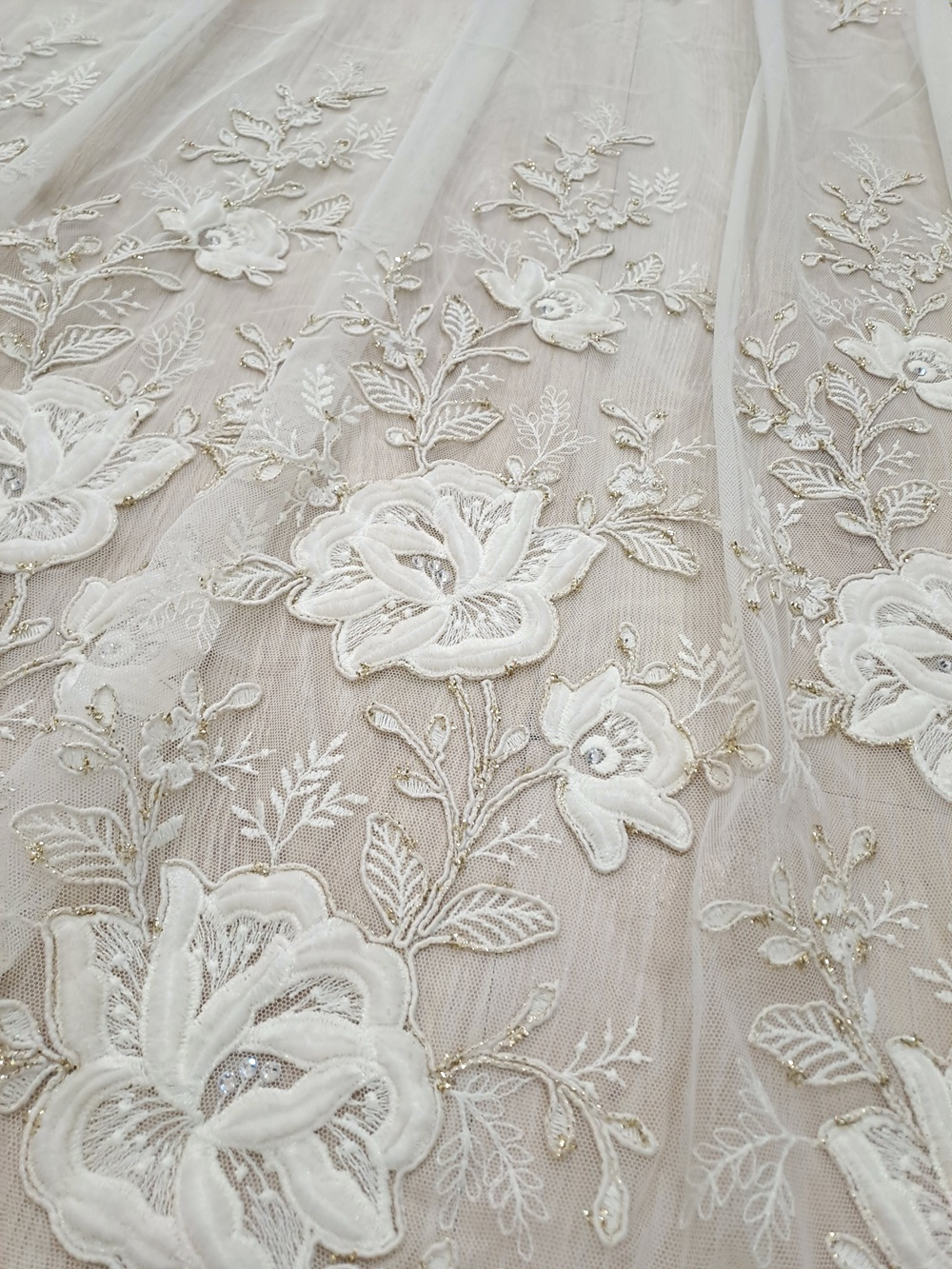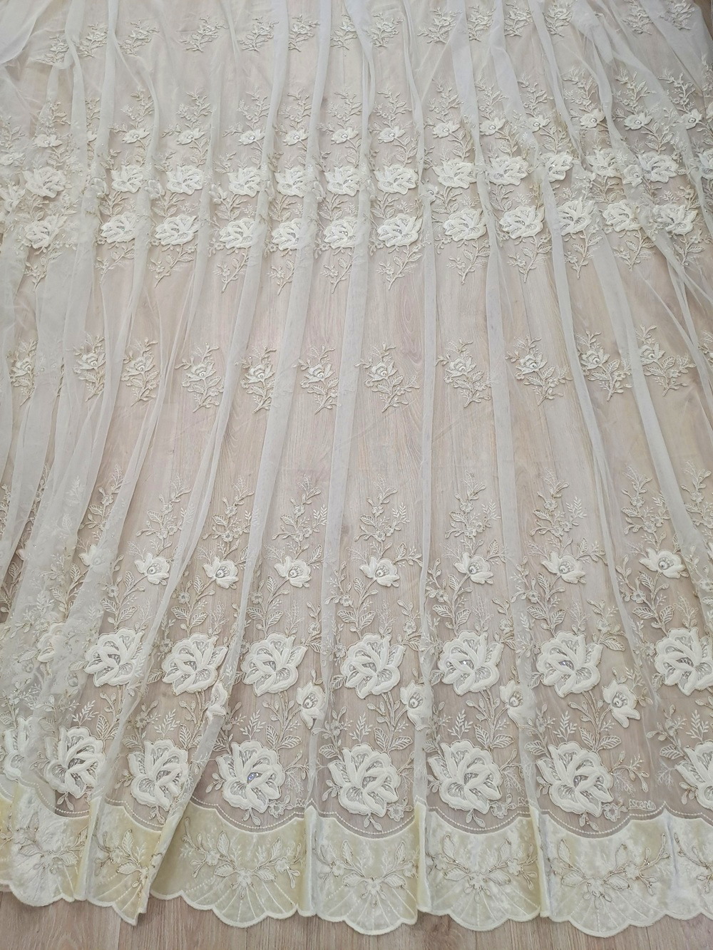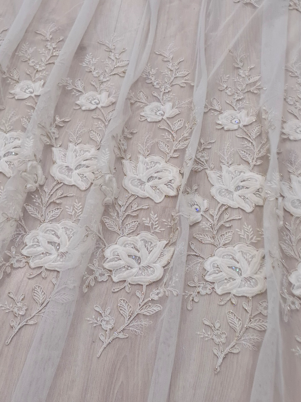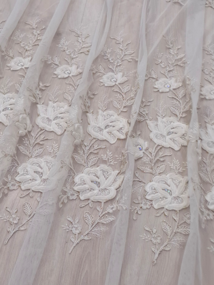 Este o perdea ivoar pe suport de tull brodată cu trandafiri ieșiți ușor în relief. Are aplicații de cristale. În partea marginală are colțișori din catifea crem. Modelul este dispus în borduri orizontale pe înălțime.
