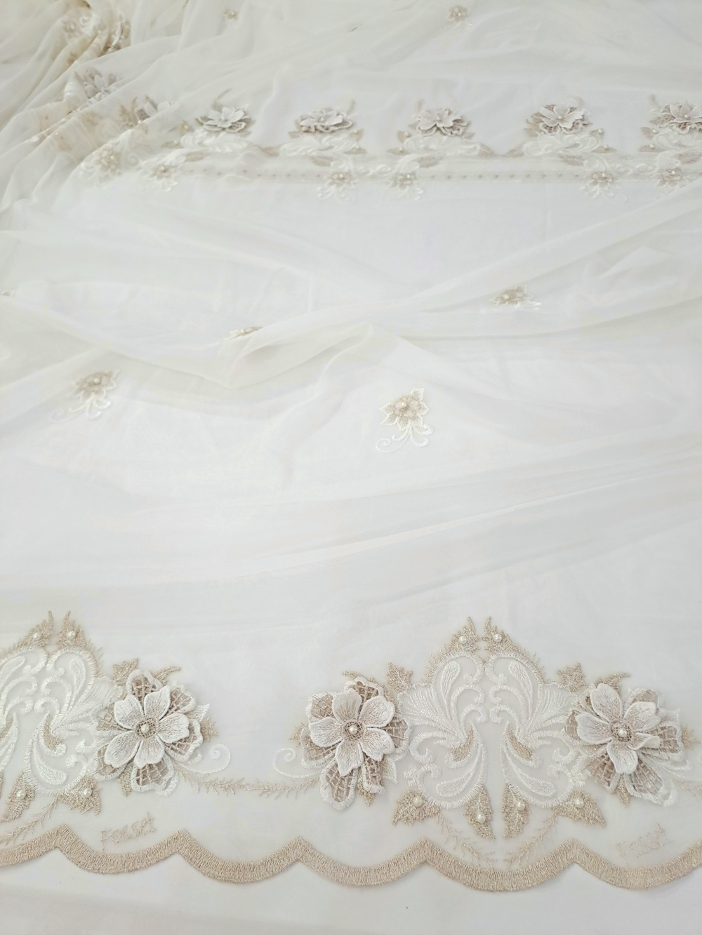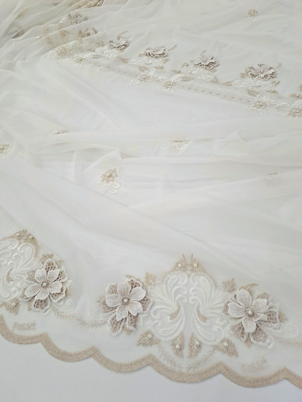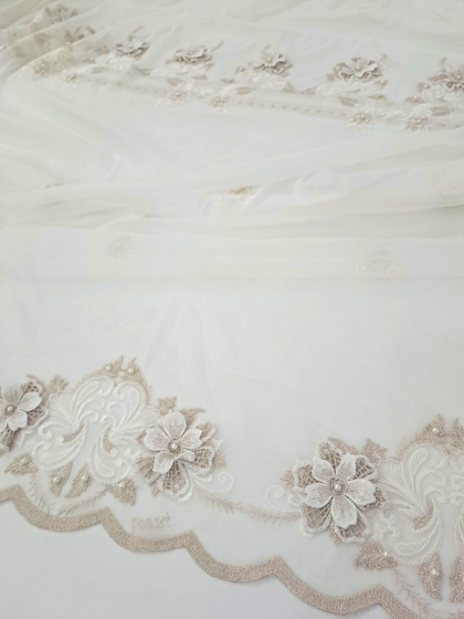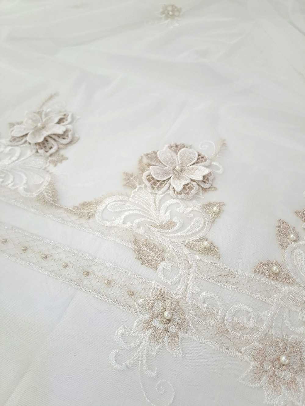Este o perdea ivoar cu broderie florală ivoar cu bej în relief accesorizată cu perle.