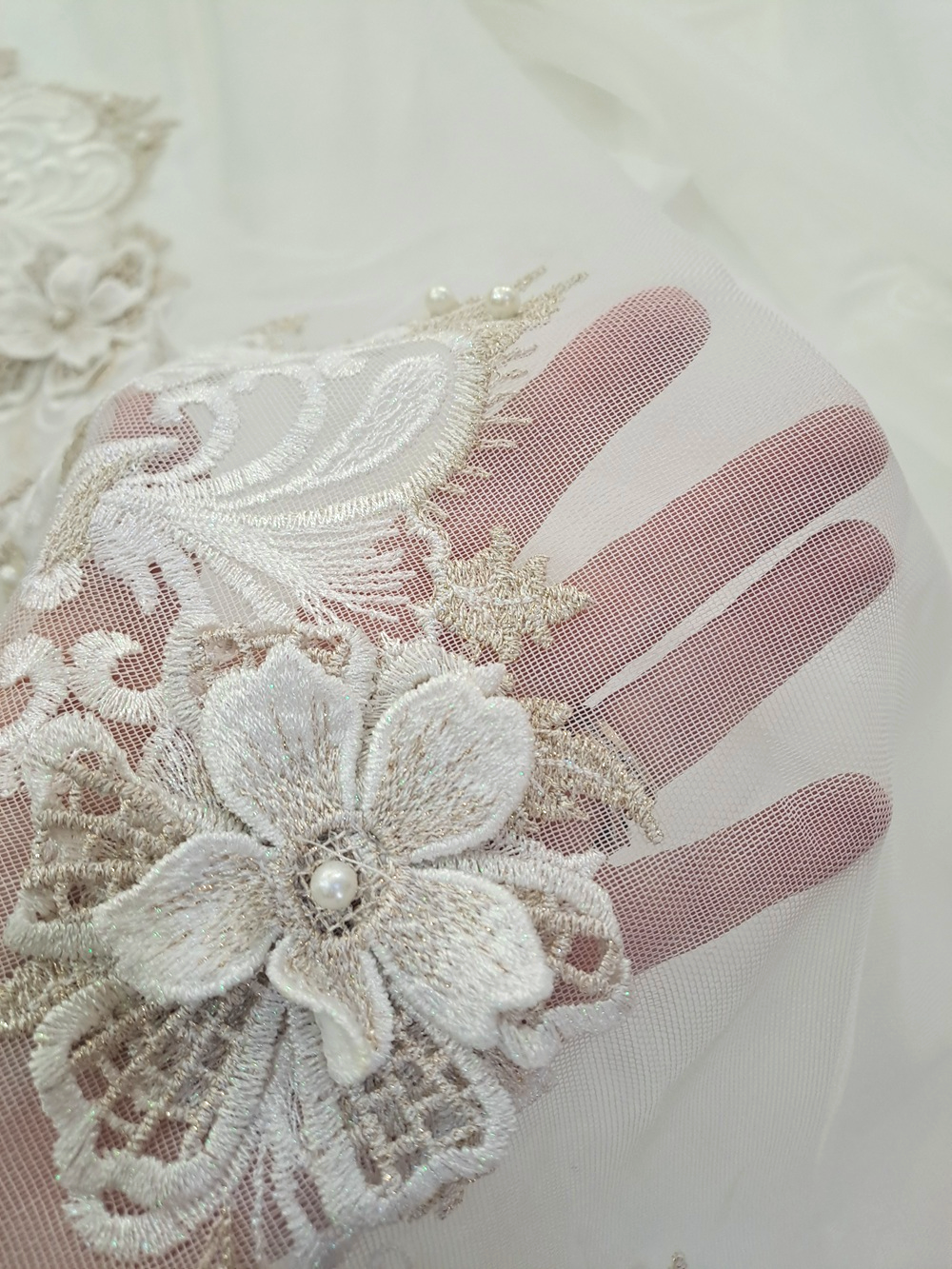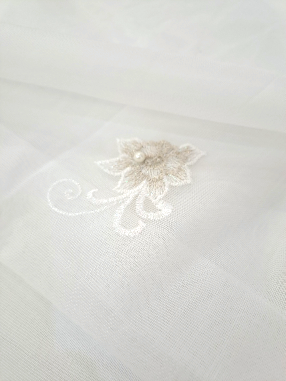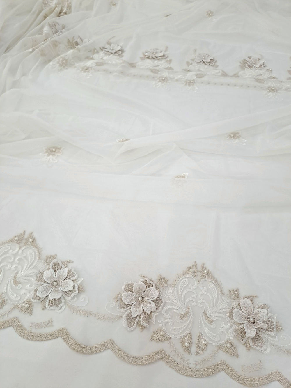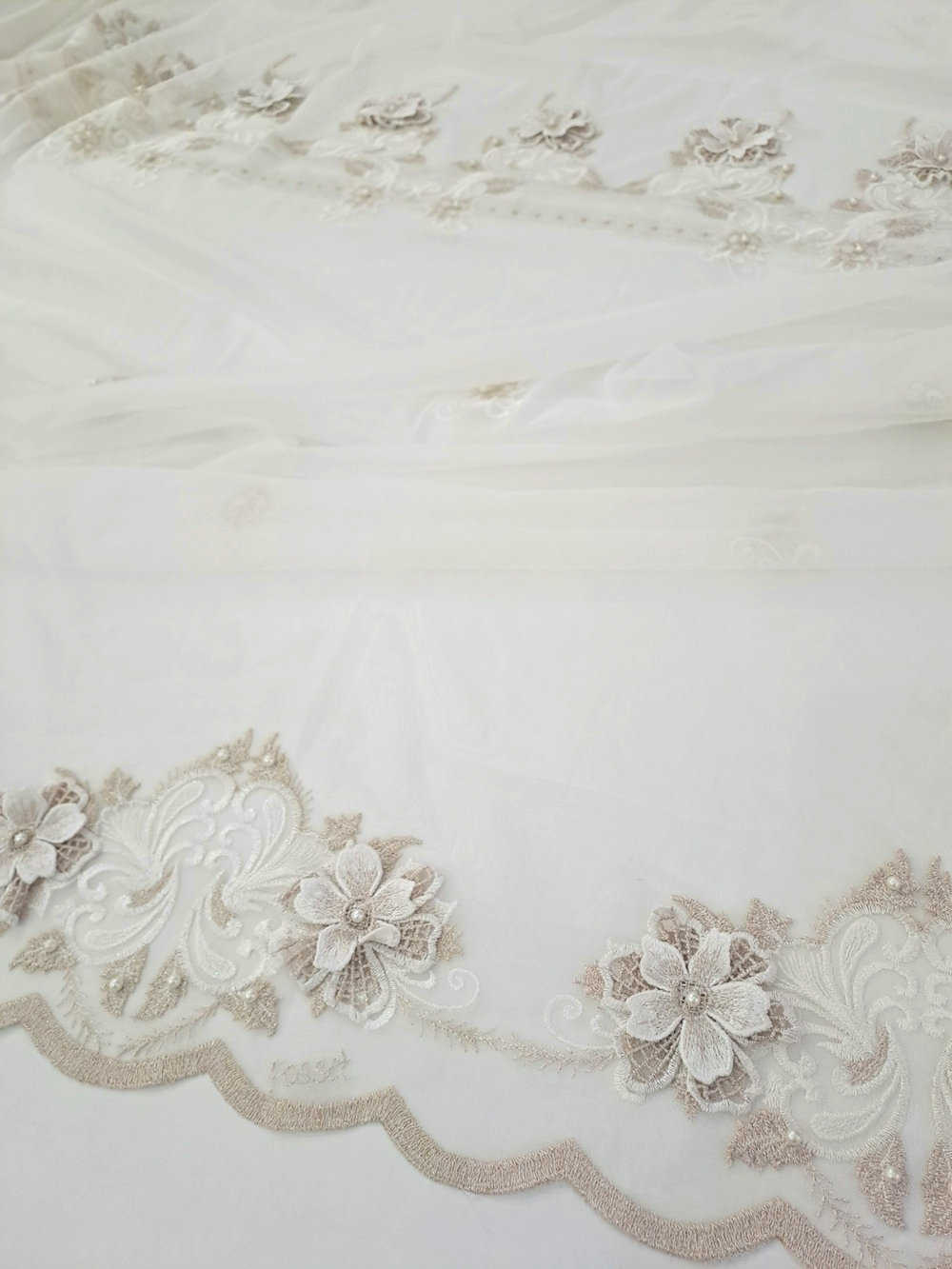 Este o perdea ivoar cu broderie florală ivoar cu bej în relief accesorizată cu perle.