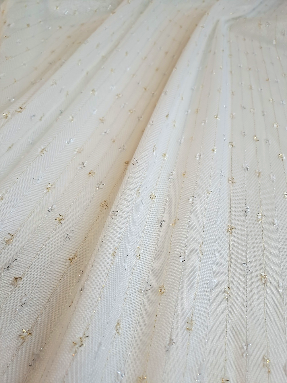 Este o perdea mată cu model în brăduleț (zig-zag) cu fire lame aurii și argintii verticale pe înălțime.