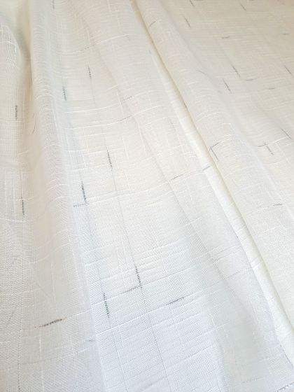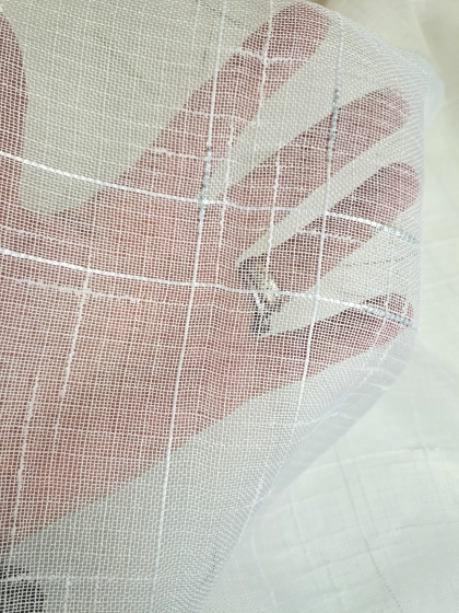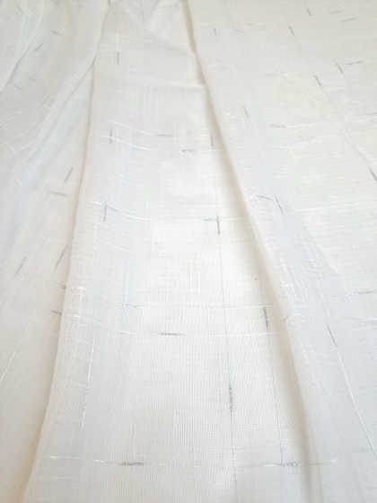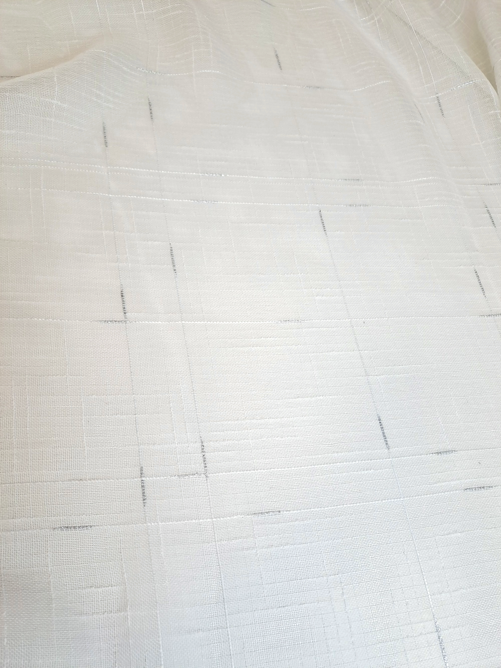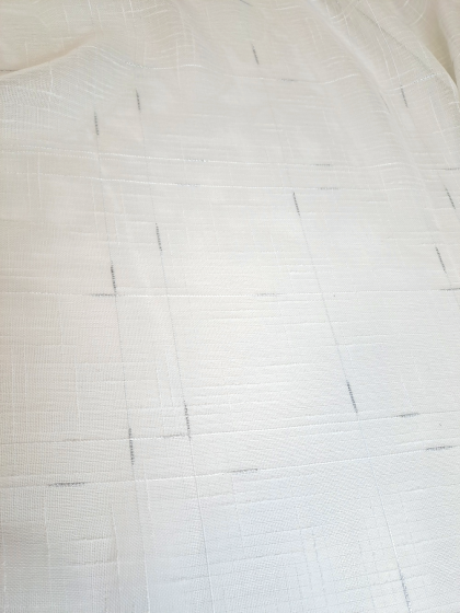 Este o perdea ivoar imitație de in cu inserții fir lame argintiu. Pe lângă firele lame are și fire îngroșate dispuse în pătrate.