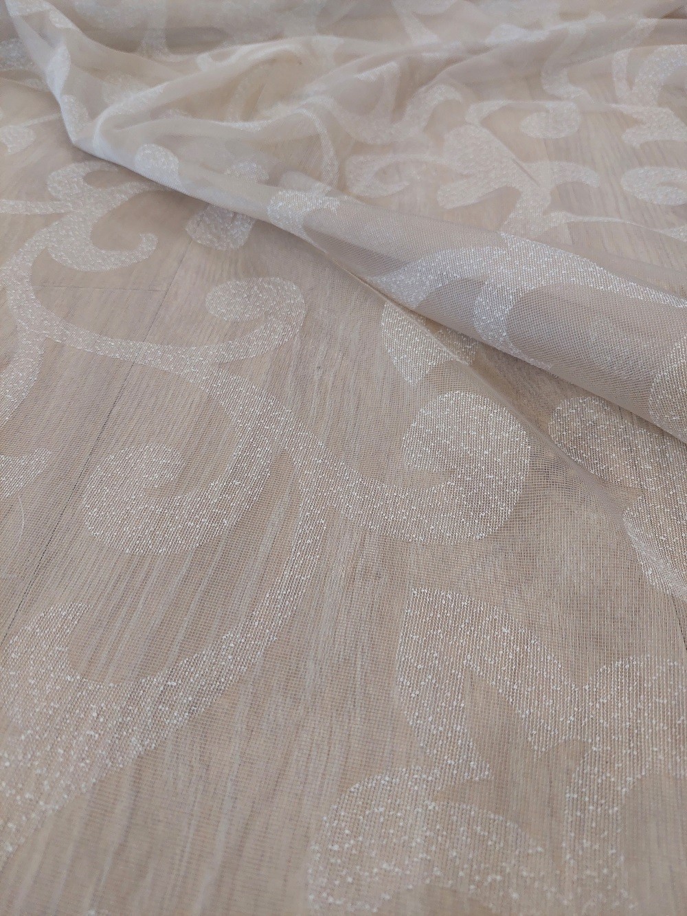 Este o perdea pe suport de tull bej cu ghirlande clasice albe.