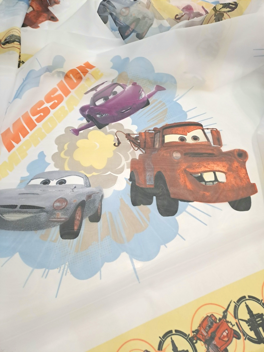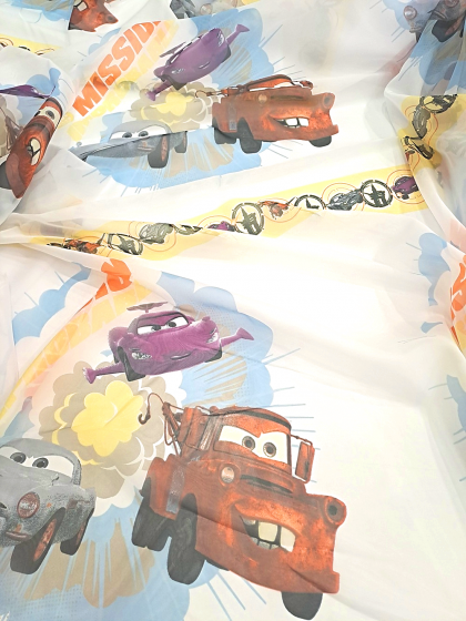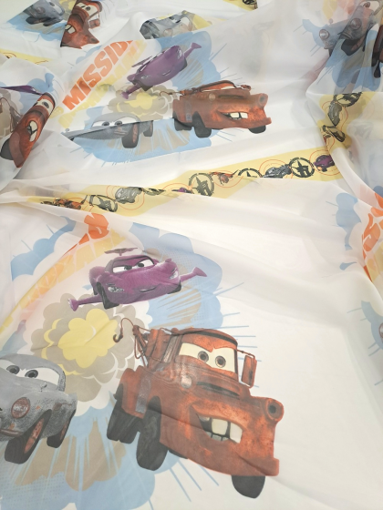 Este o perdea din voal alb imprimat cu mașinuțe de epocă.