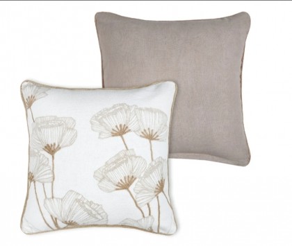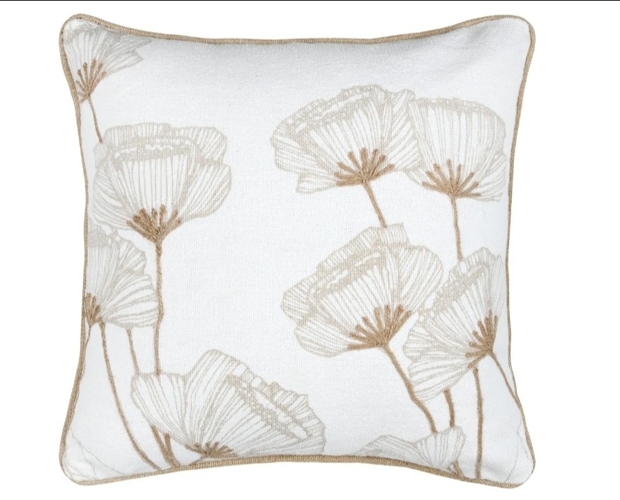 Este o pernă decorativă culoare ivoar cu model floral bej natur.