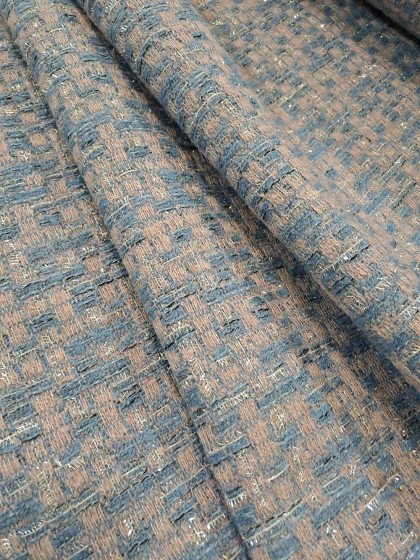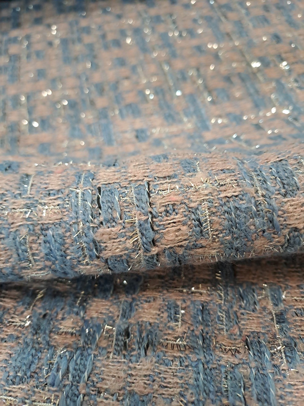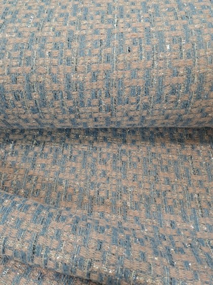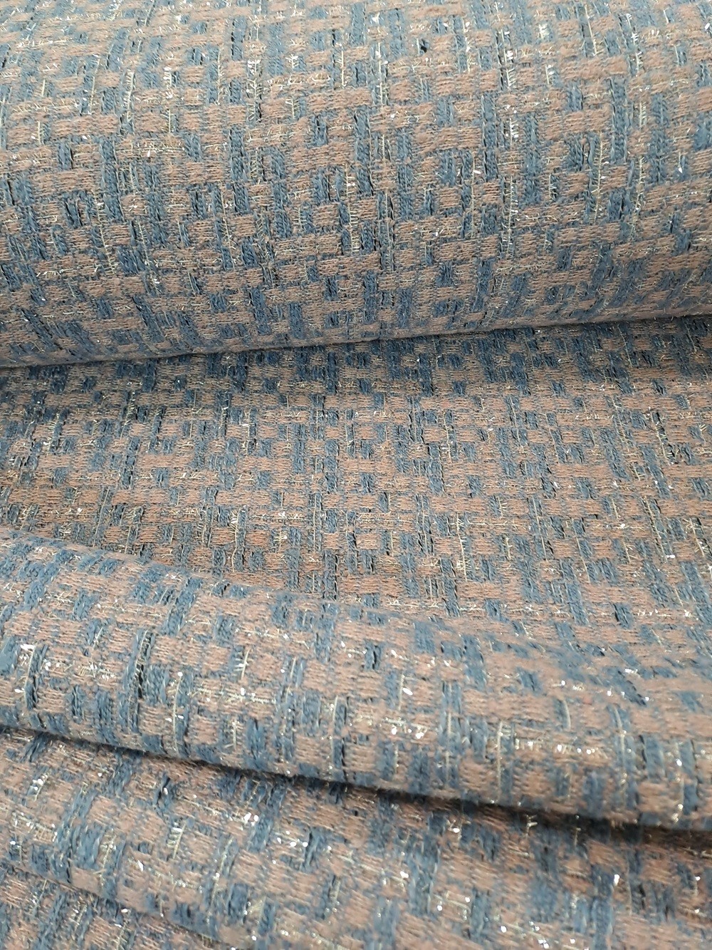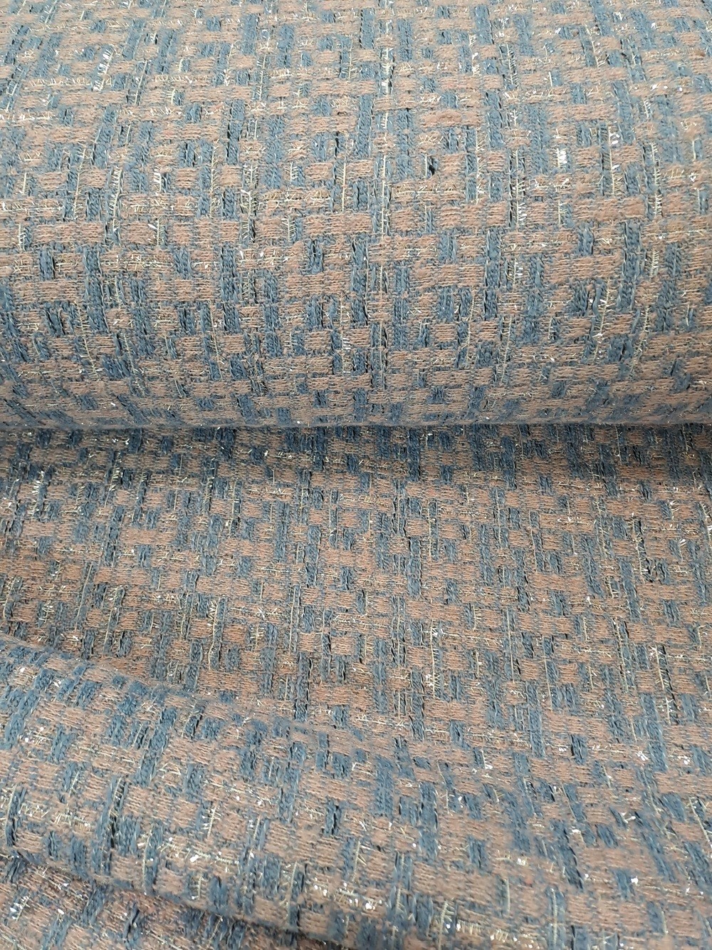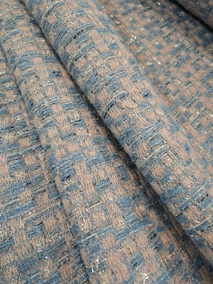 Este o stofă Chanel bleu cu roz prăfuit. Are inserție de fir lame argintiu.