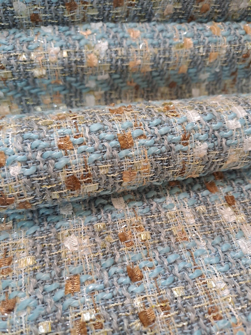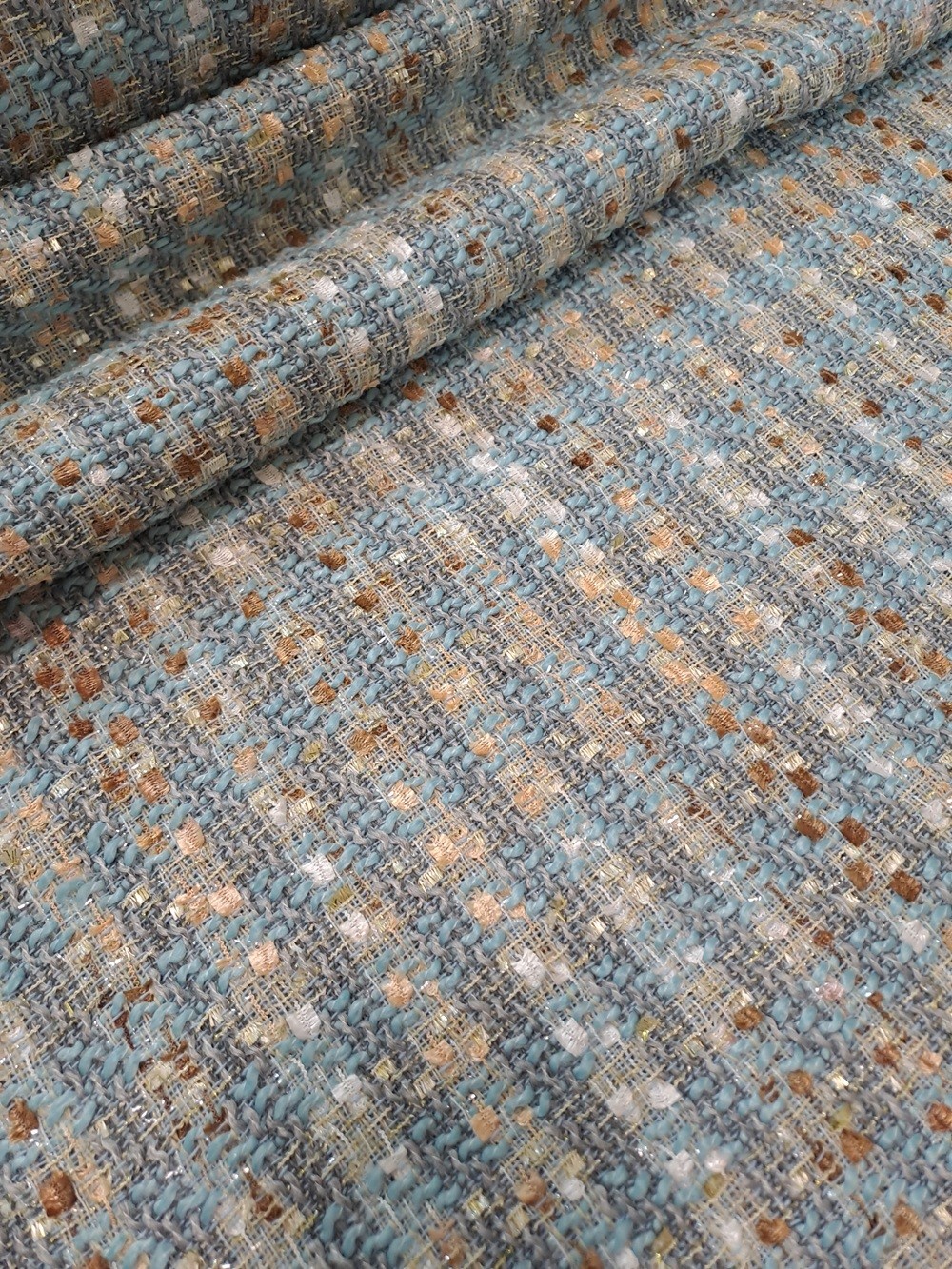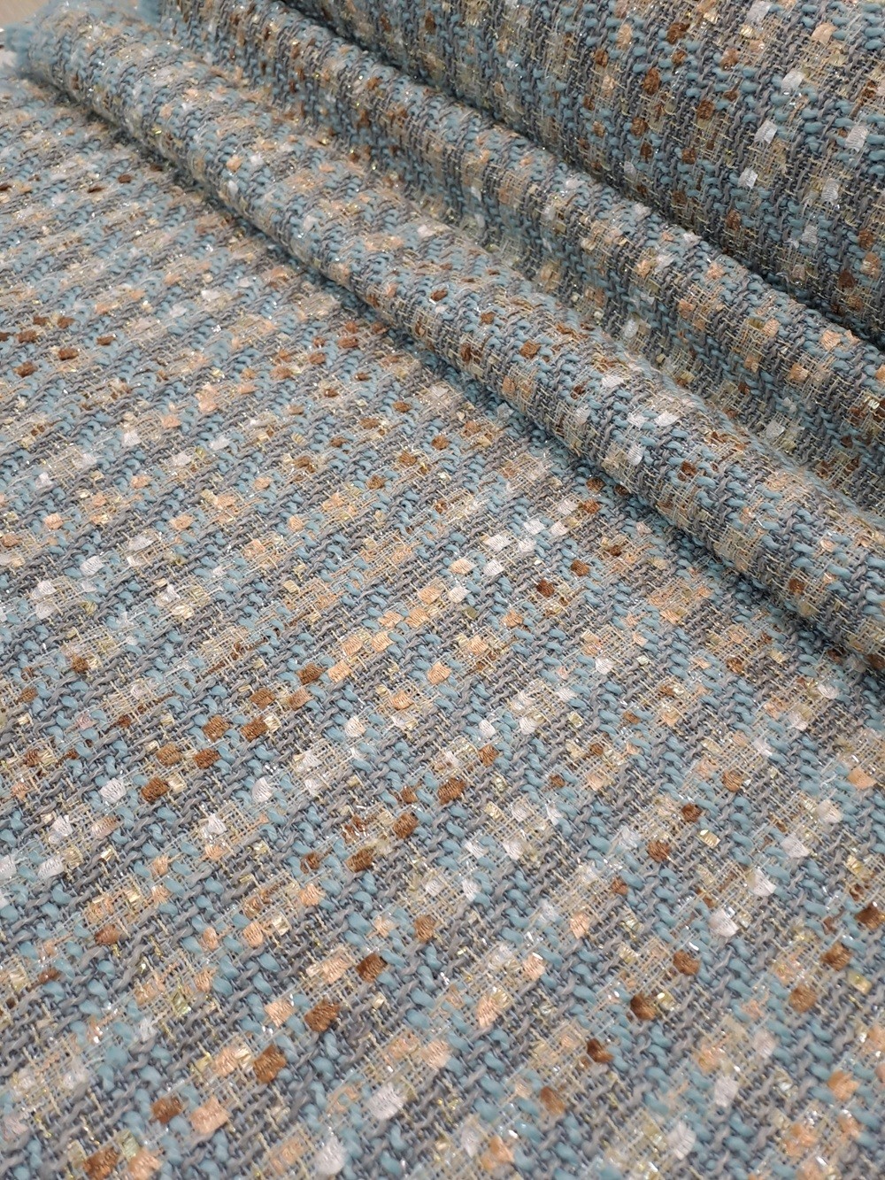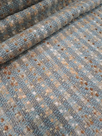 Este o stofă Chanel bleu, ivoar, caramel cu fir lame auriu.