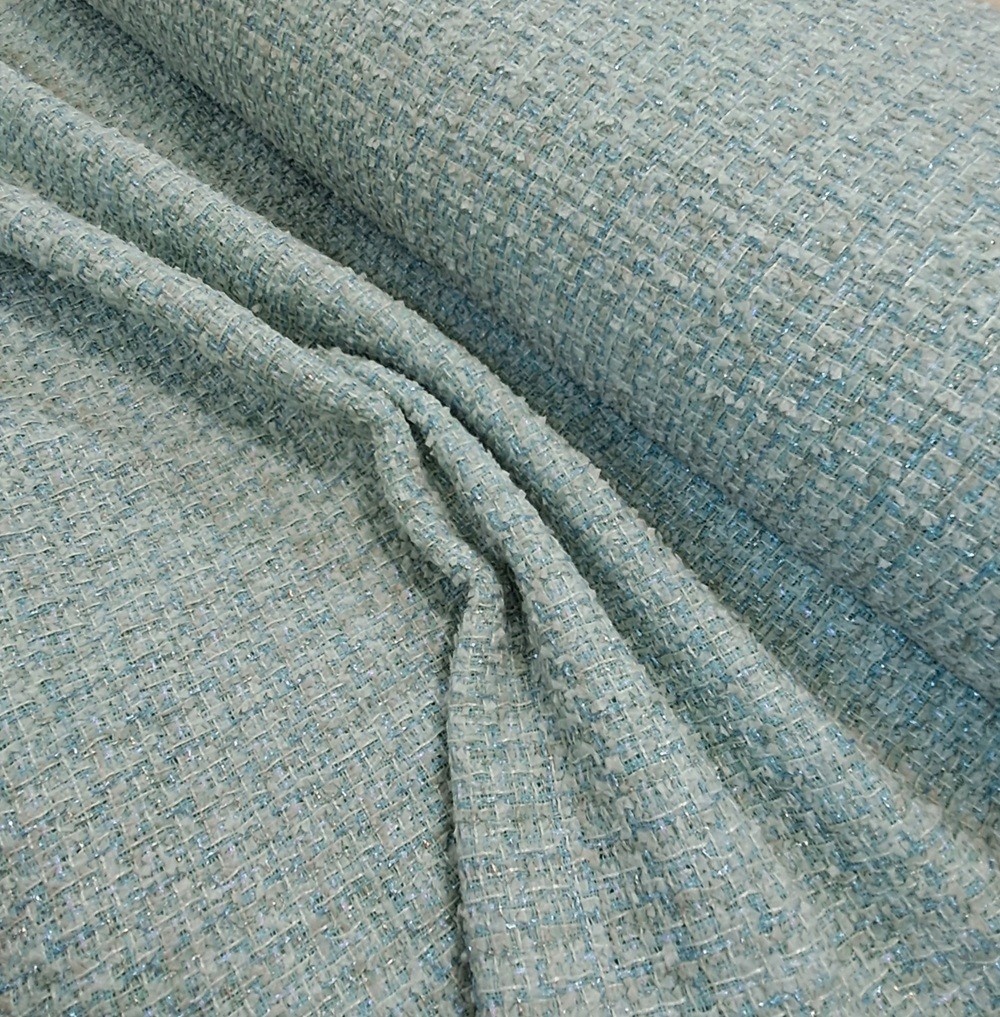 Este o stofă Chanel (Tweed) turcoaz deschis cu fir lame argintiu și bleu.