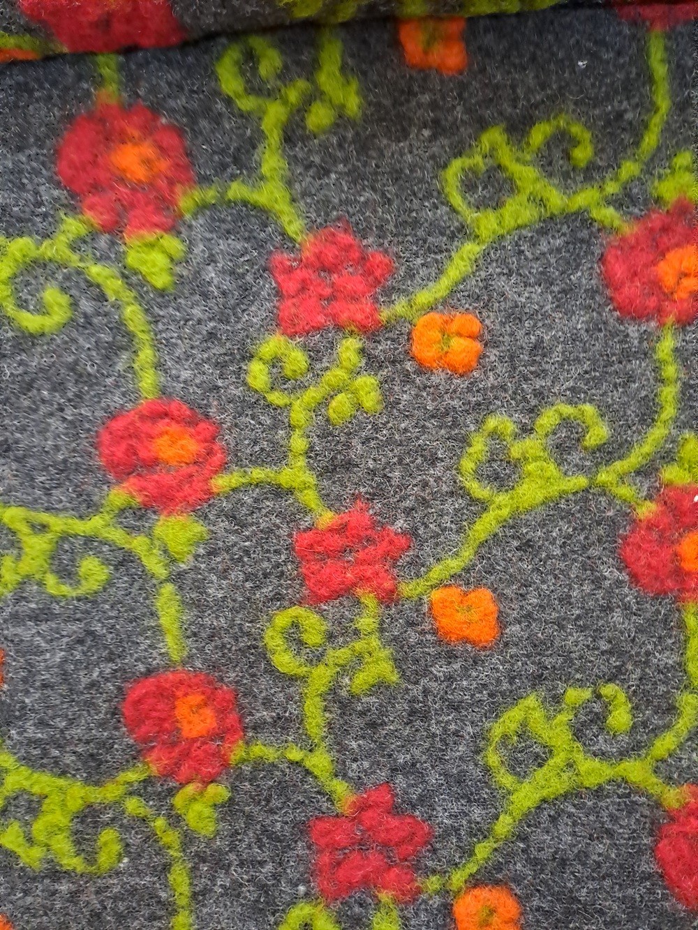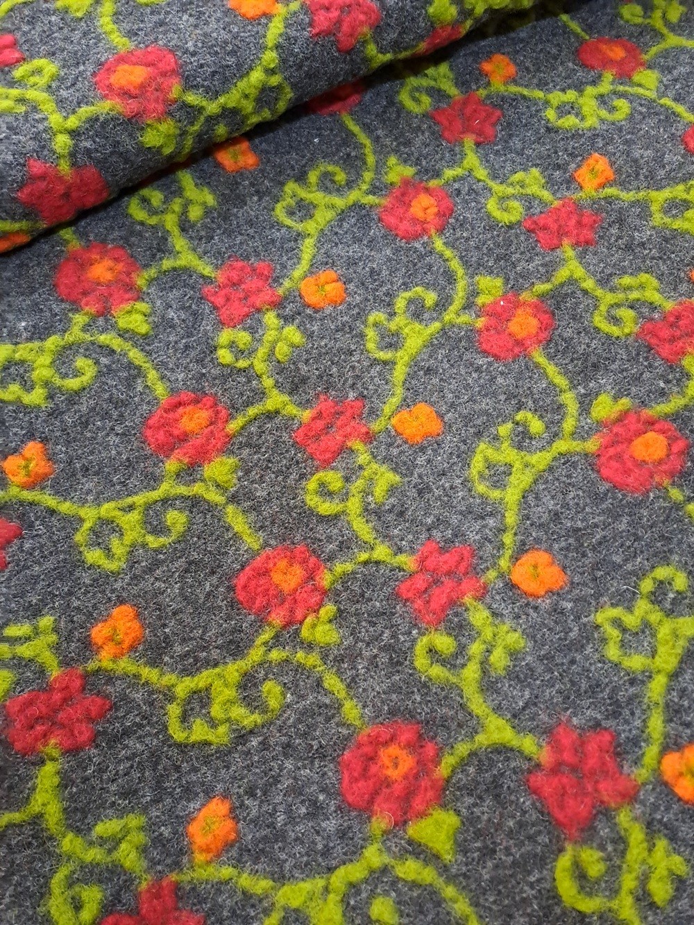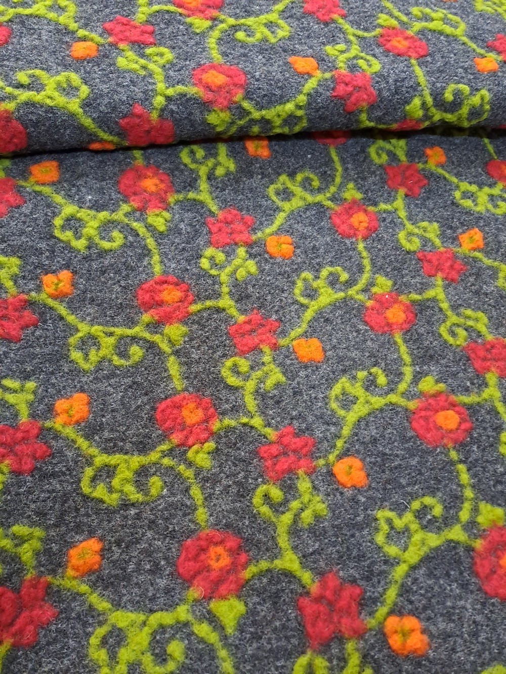 Este o stofă din lână 100% pe fond gri închis cu model floral roșu cu portocaliu.
