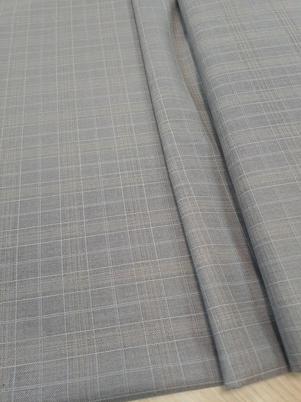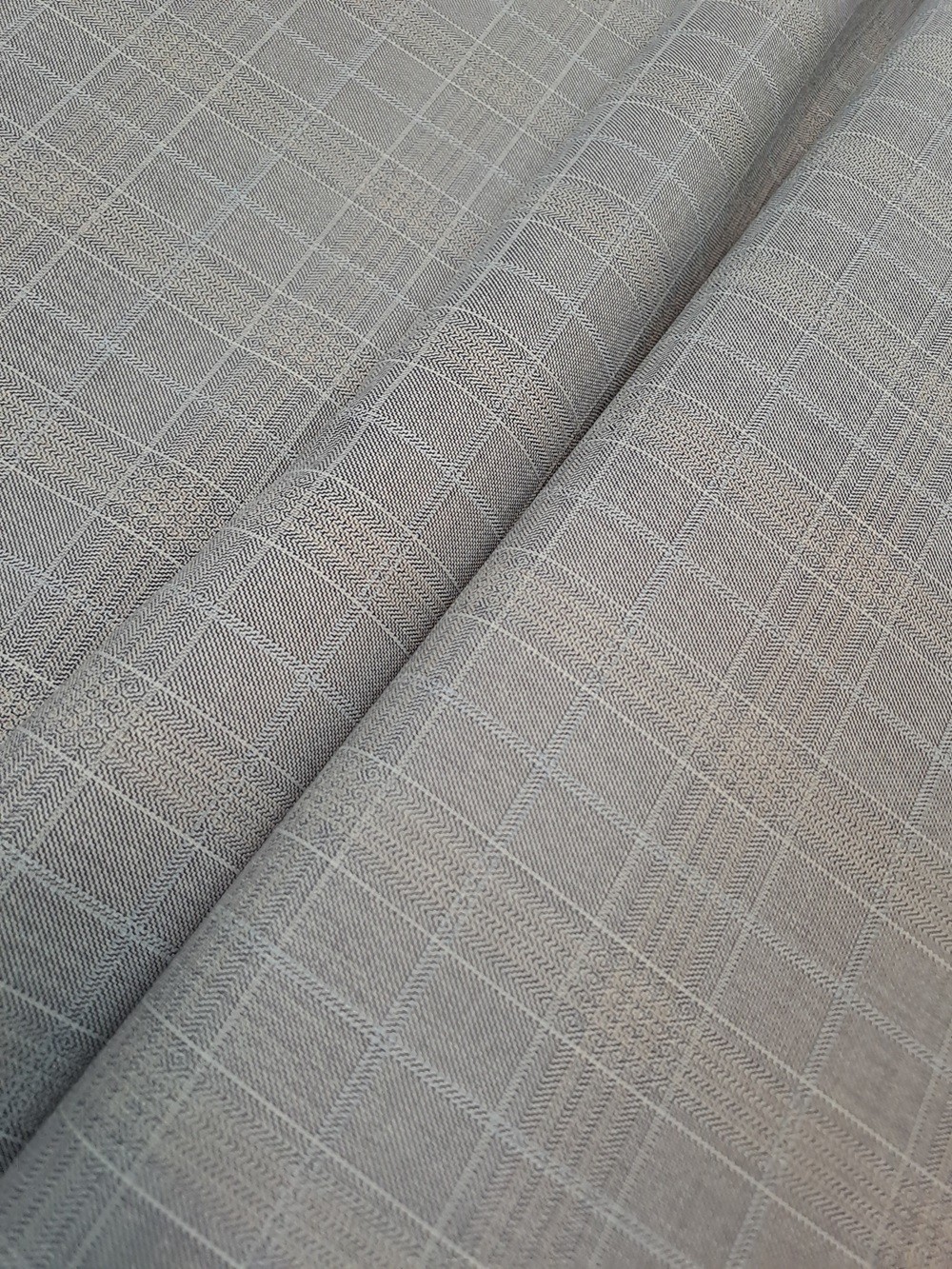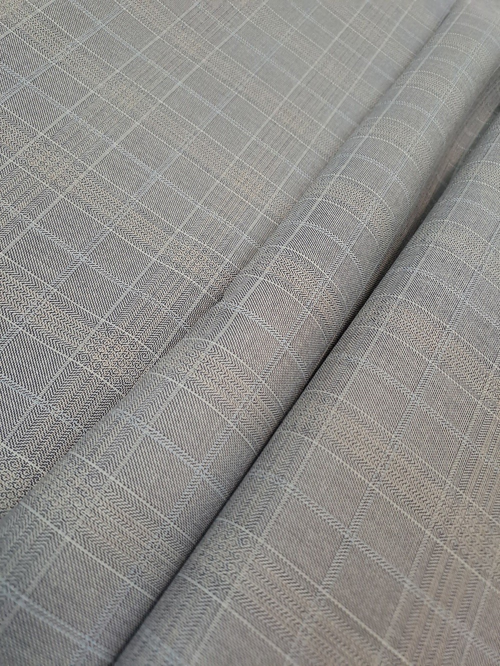 Este o stofă elegantă clasică în carouri gri cu bej potrivită pentru costume de bărbați.