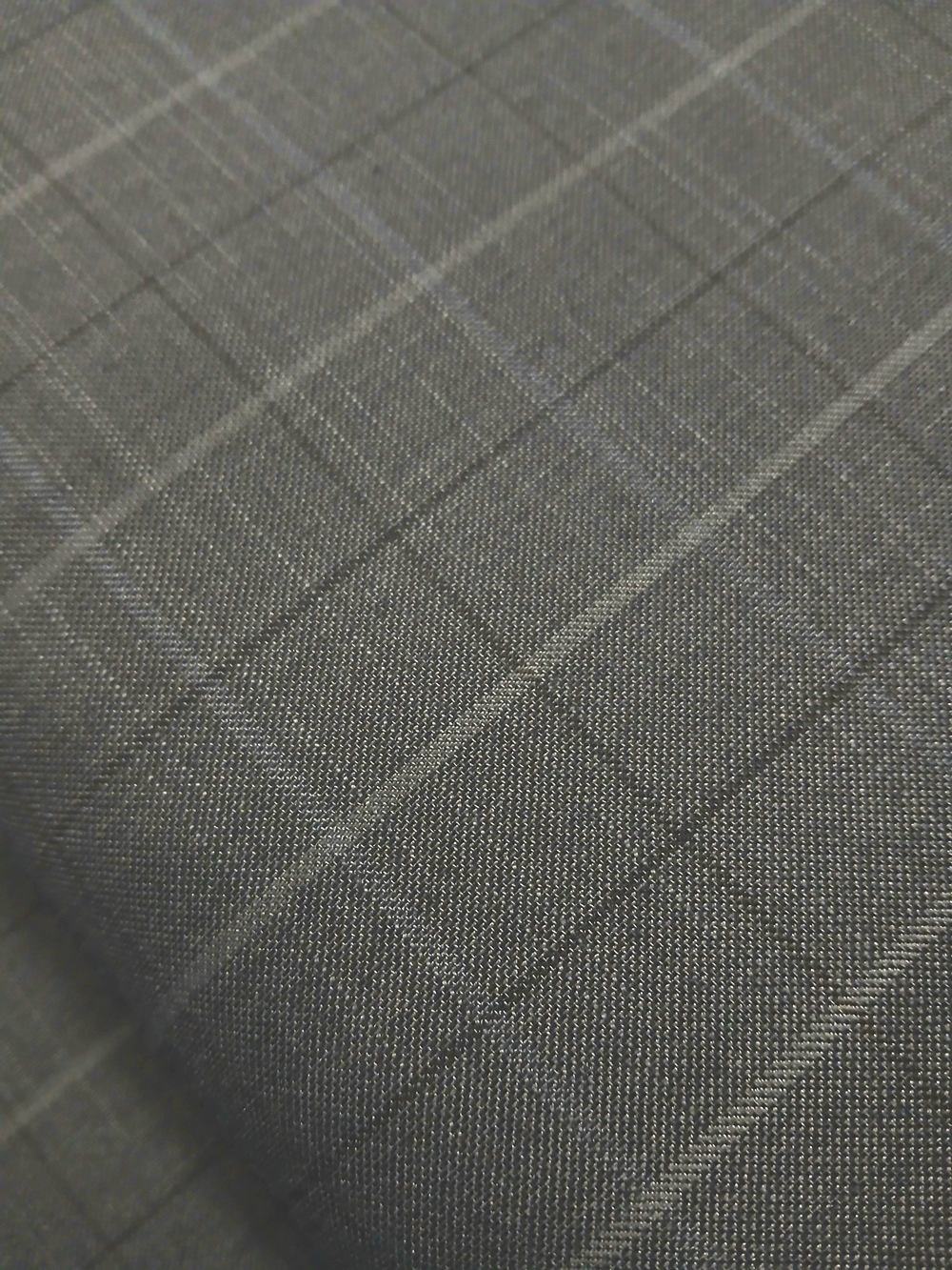 Este o stofă subțire gri închis în carouri negru cu gri albăstrui potrivită pentru costume bărbătești.