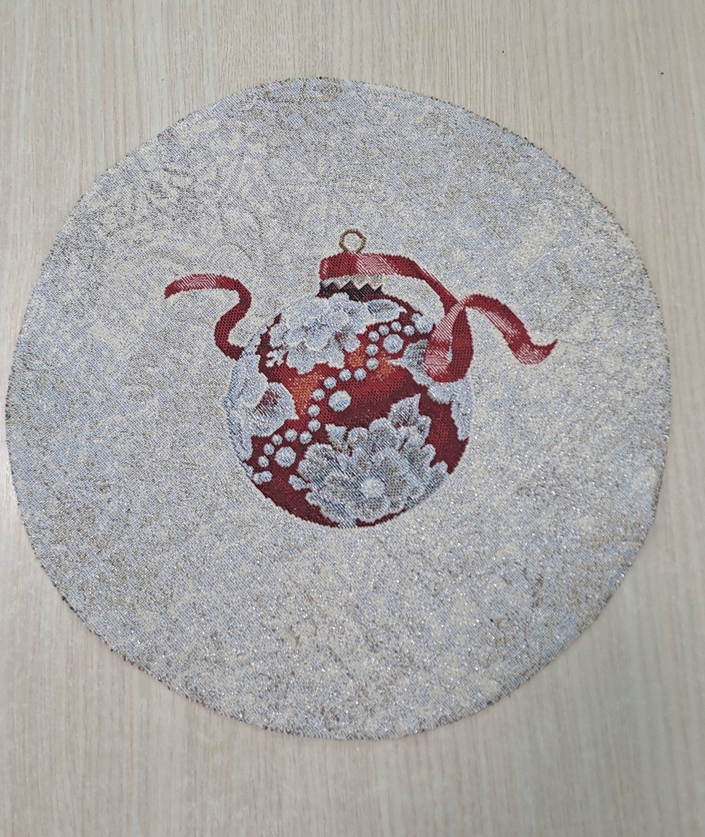 Suport pentru farfurii din goblen cu decor de Crăciun.