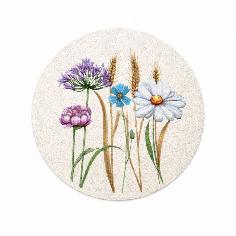 Suport goblen farfurii crem ușor patinat cu flori de câmp.
