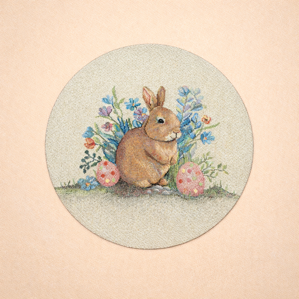 Suport goblen farfurii pe fond crem cu iepuraș.