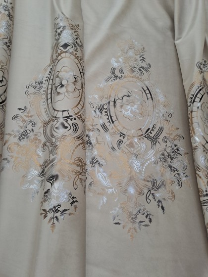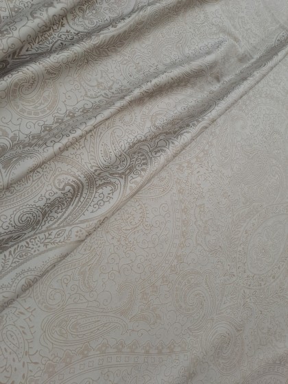 Este o țesătură pe fond bej cu ghirlande clasice ivoar.