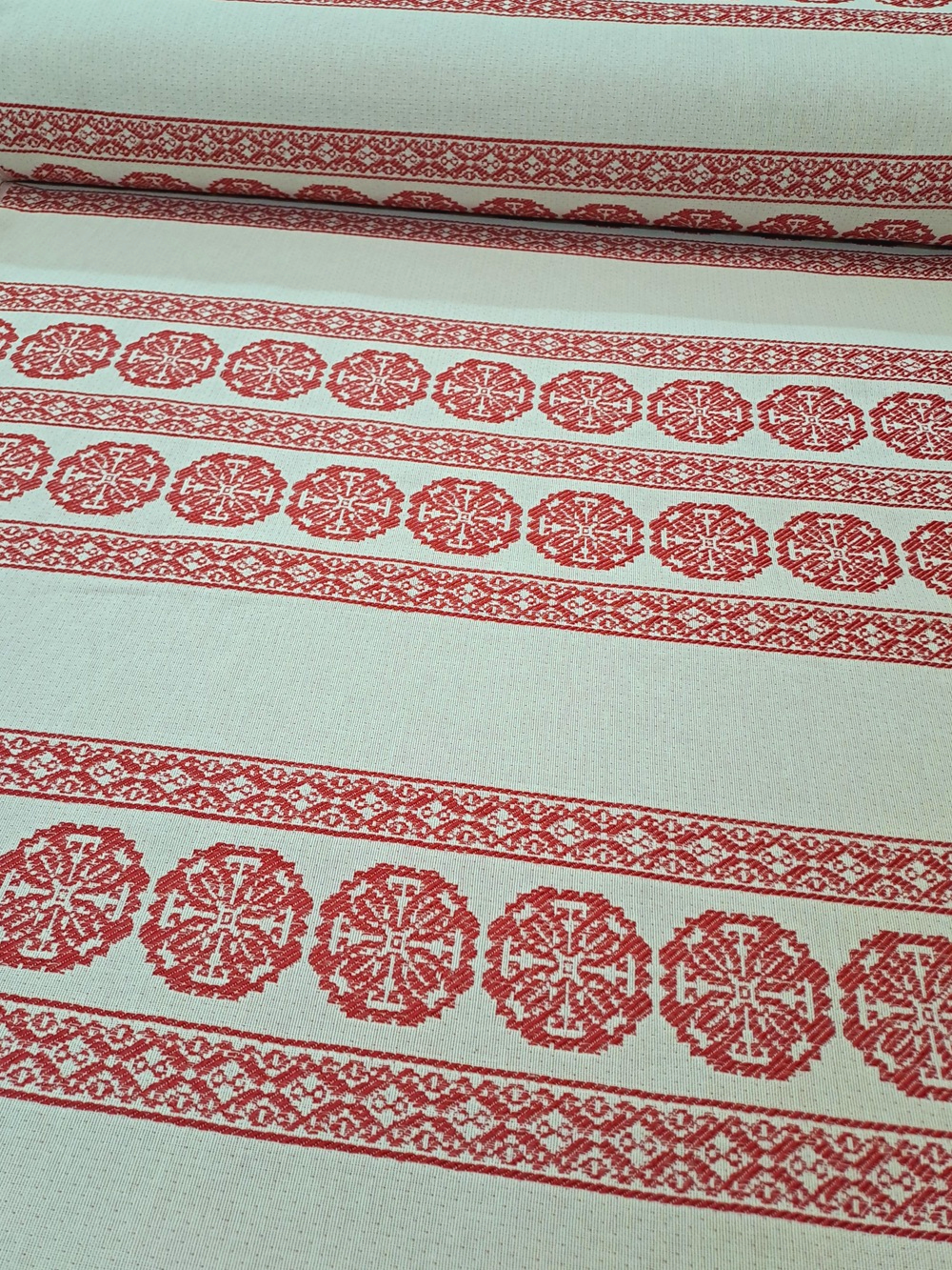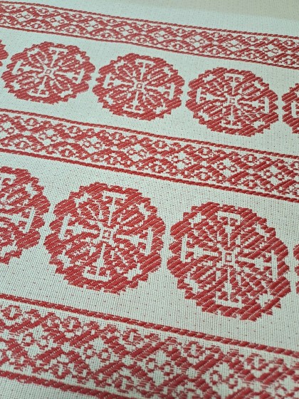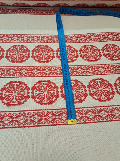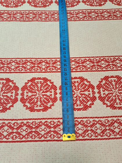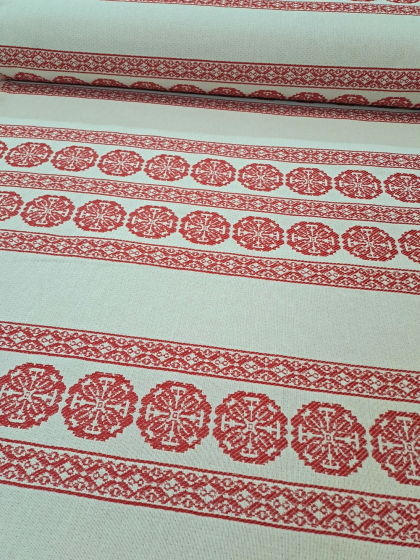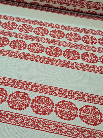 Este o țesătură rustică crem natur cu model geometric roșu. Modelul este dispus în borduri verticale pe lățimea materialului.