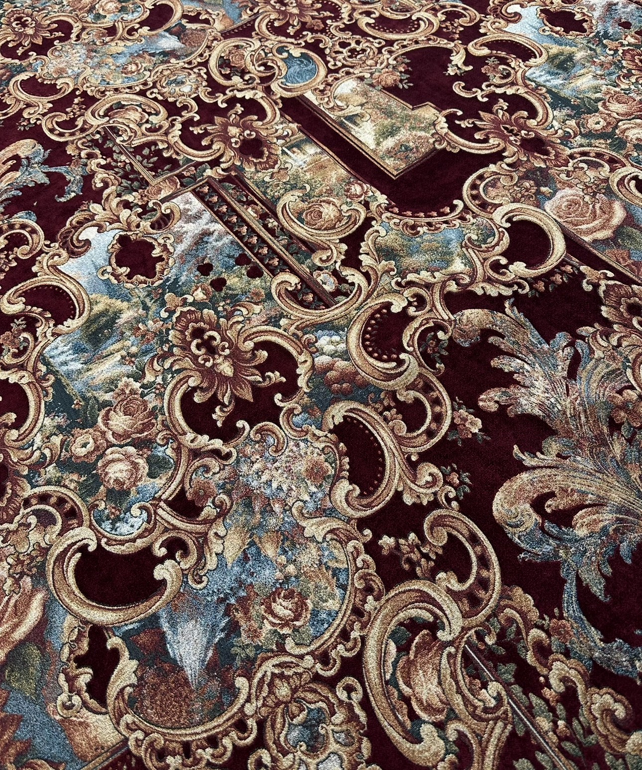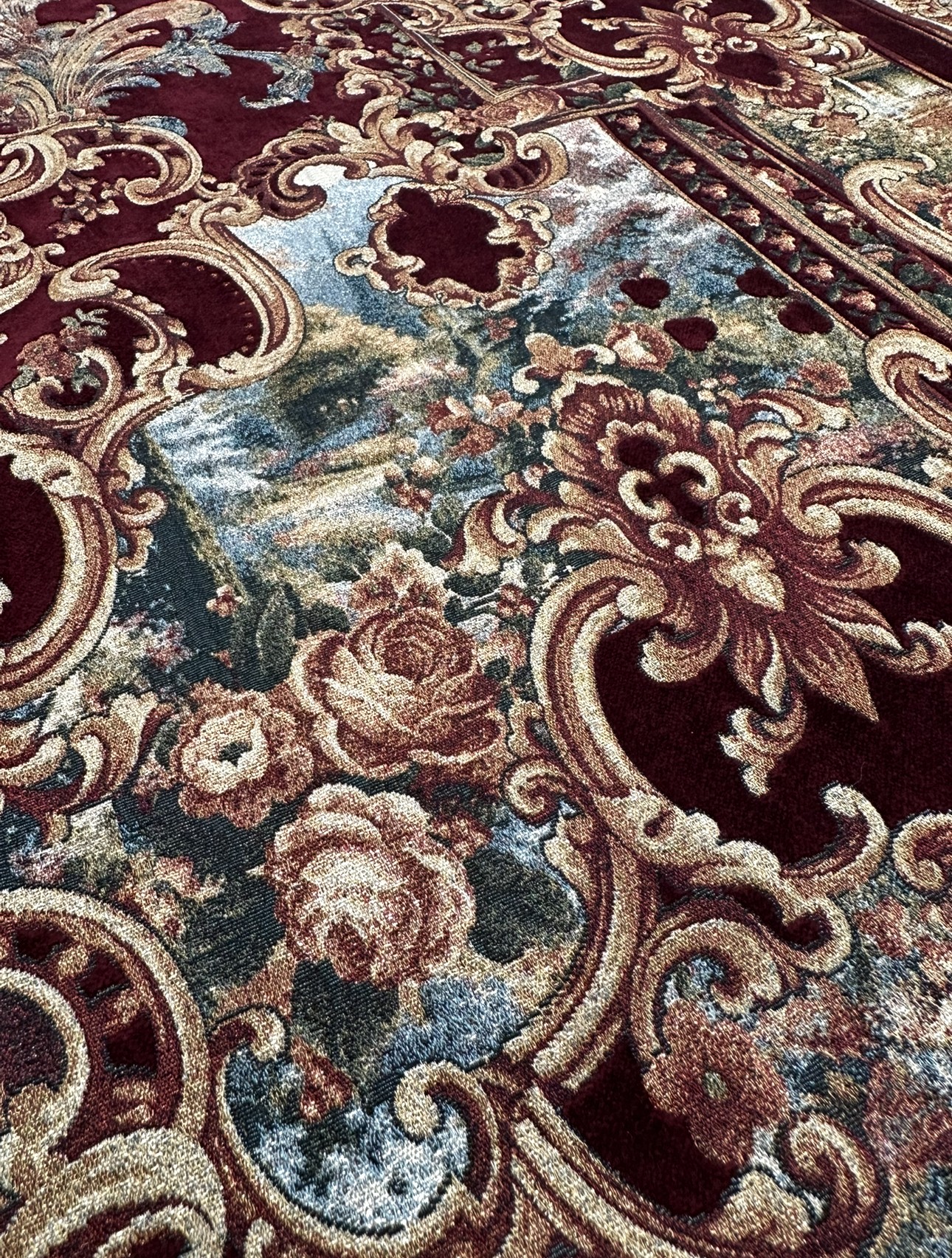 Țesătura de draperie sau tapițerie din catifea premium cu model baroc și floral vișiniu