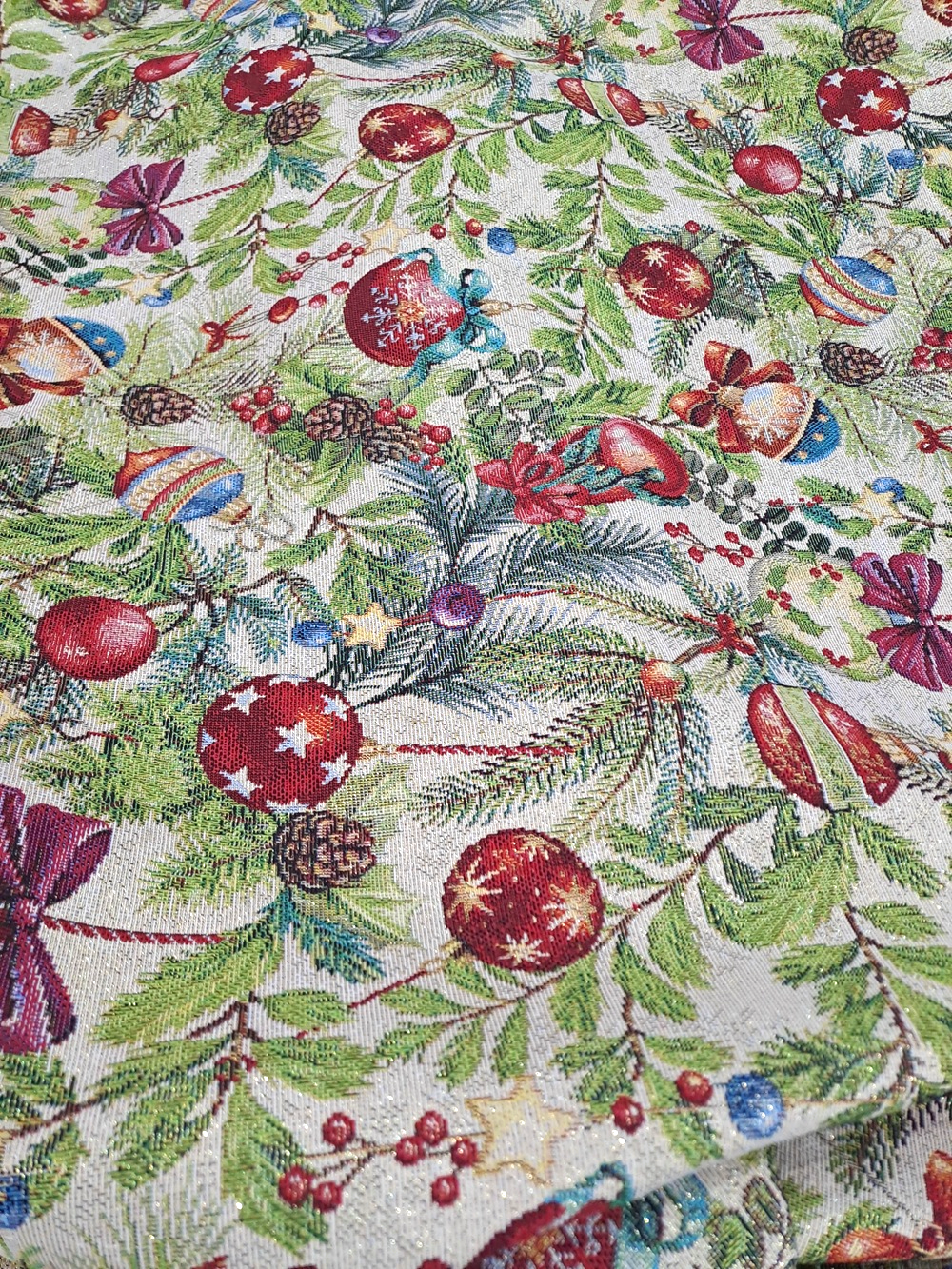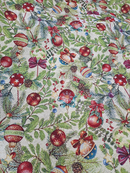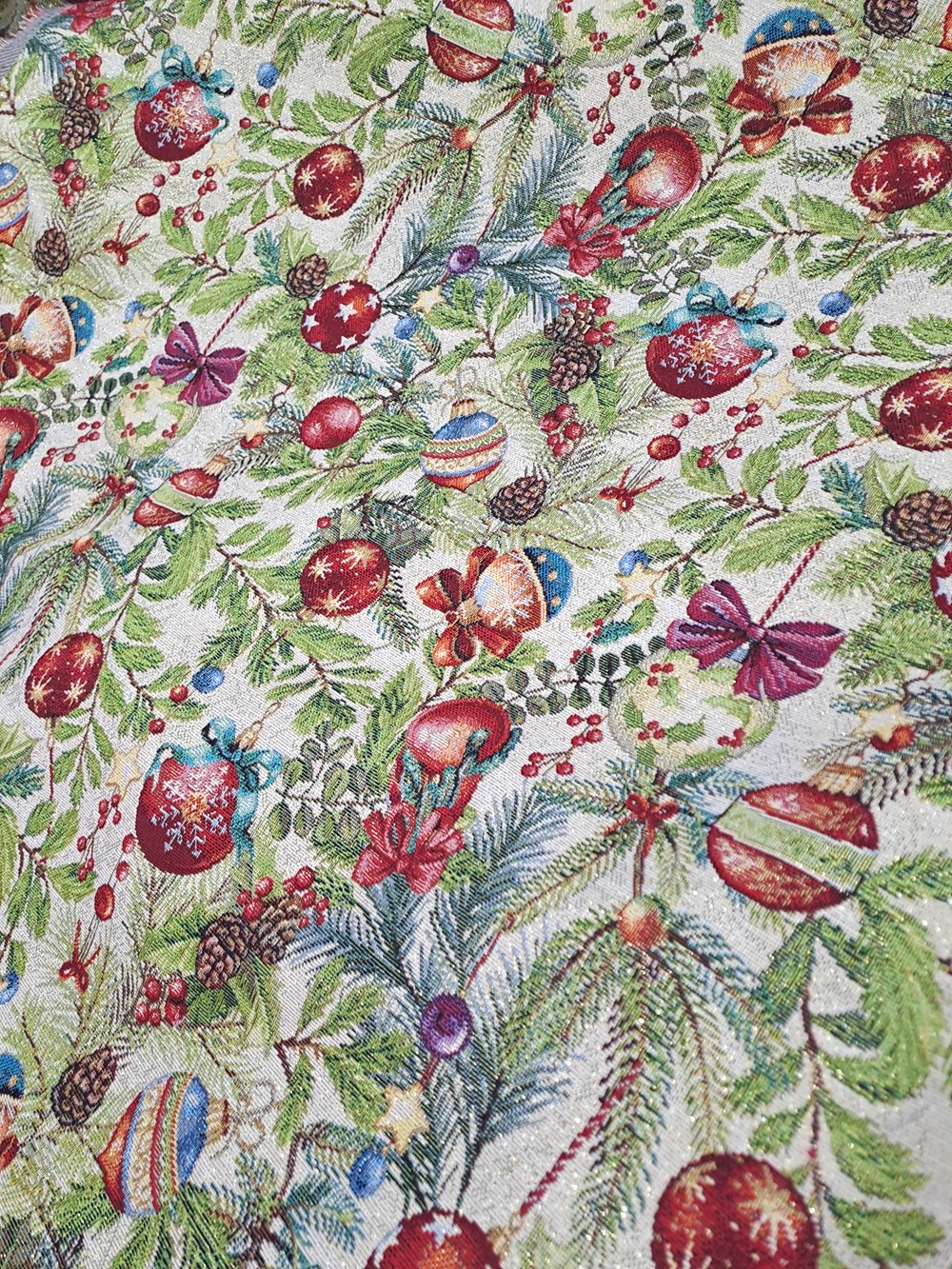 Este o țesătură tip goblen pe fond crem cu ramuri de brad și globuri de Crăciun.