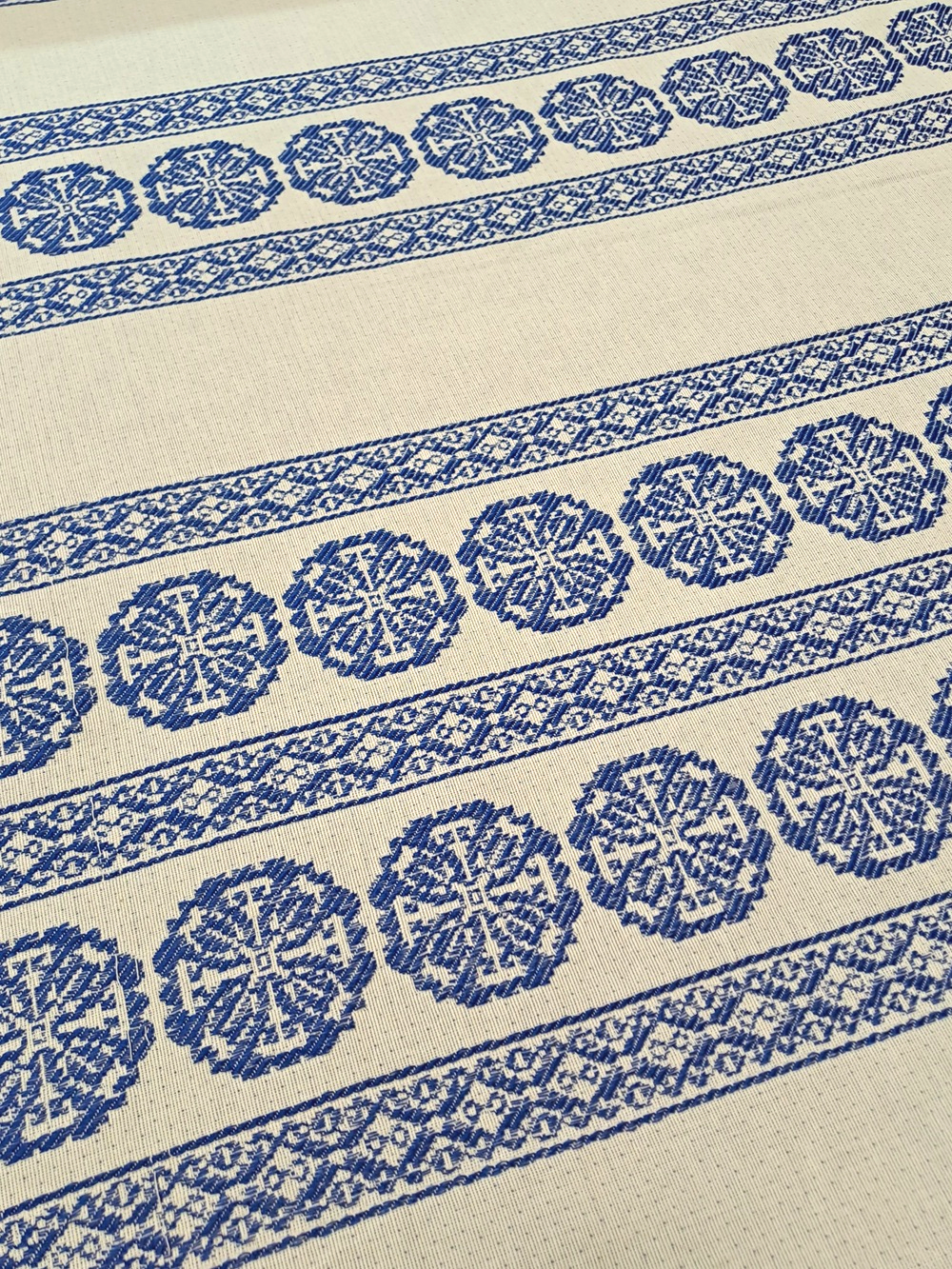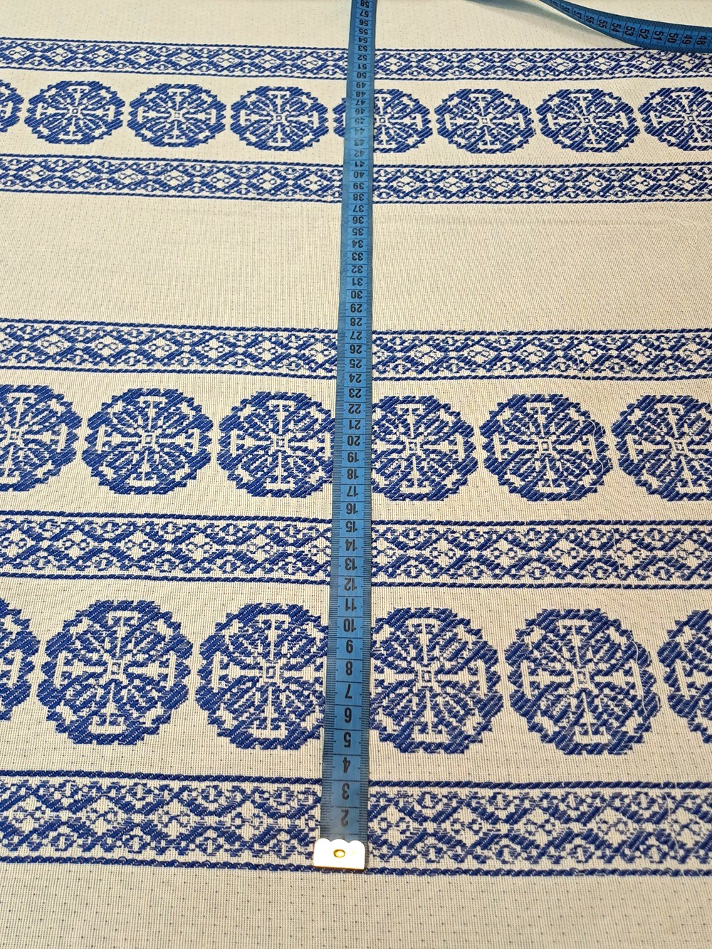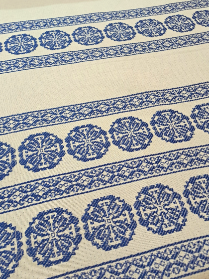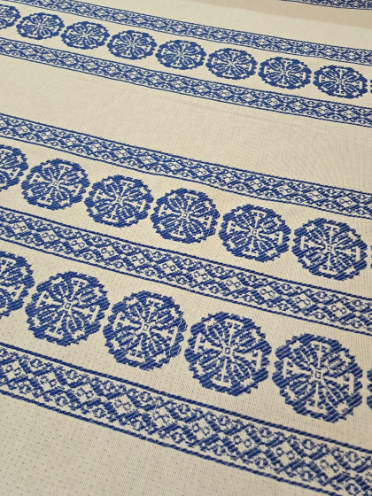 Este o țesătură rustică crem natur cu model geometric albastru. Modelul este dispus în borduri verticale pe lățimea materialului.