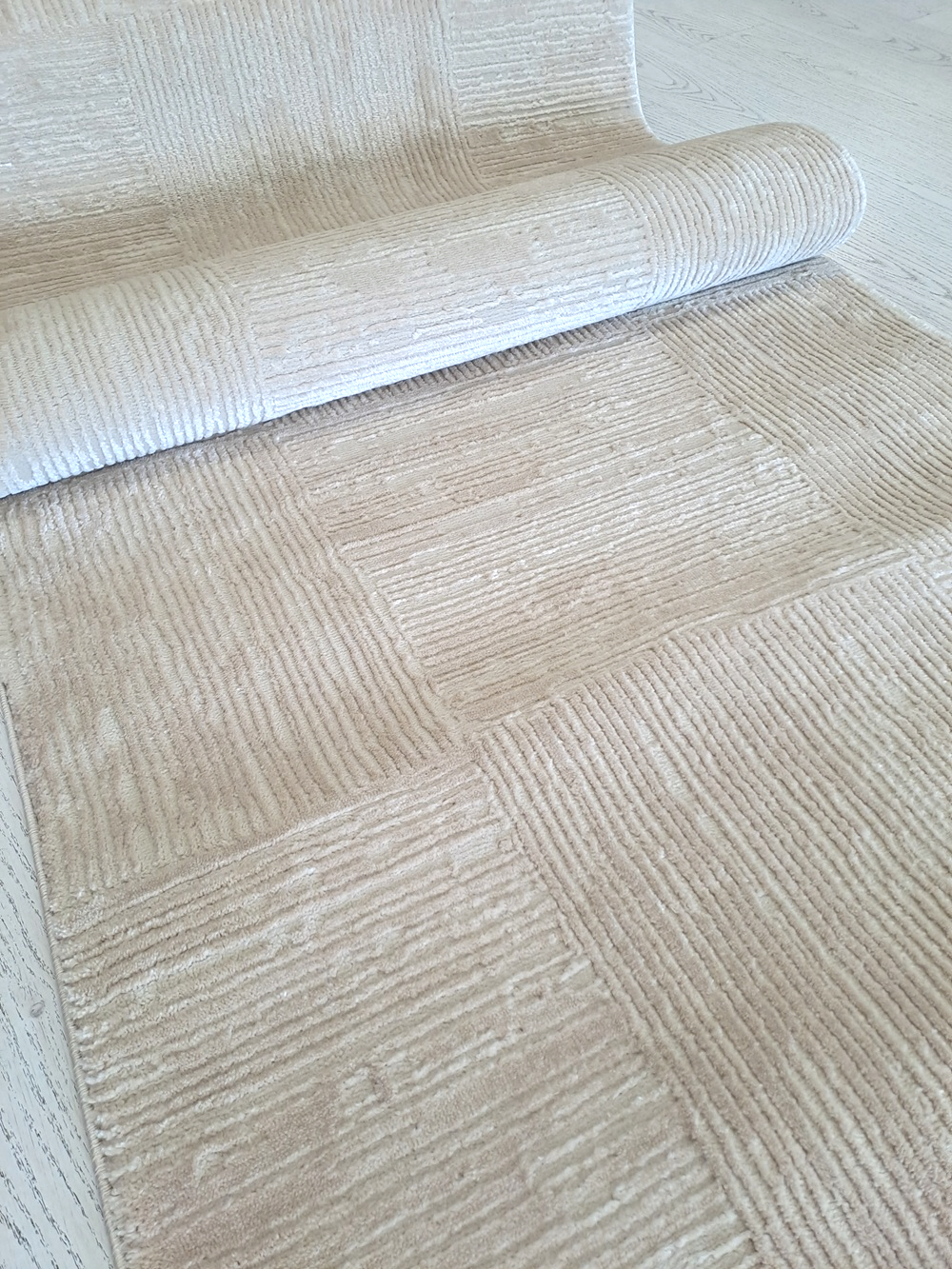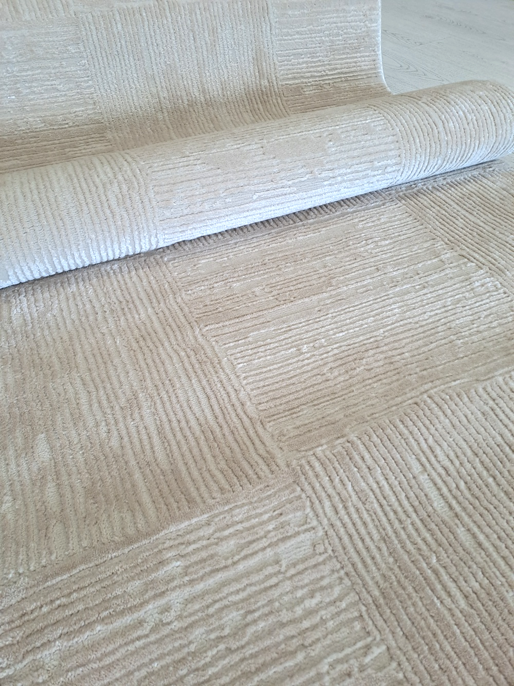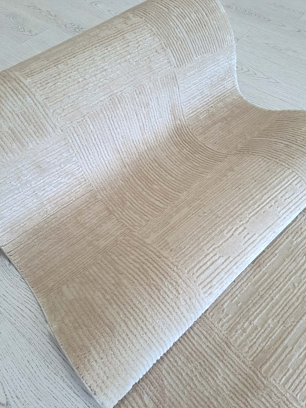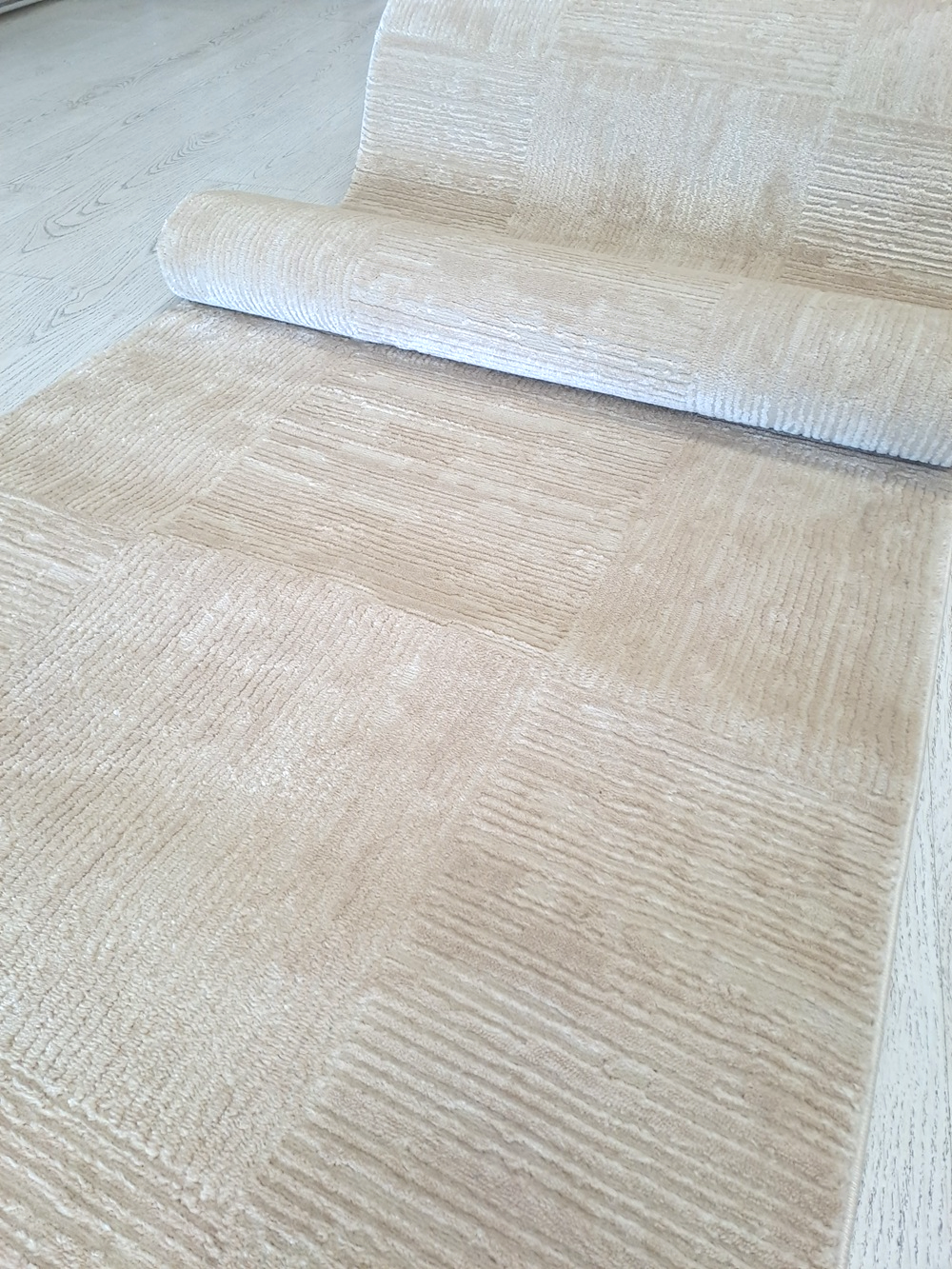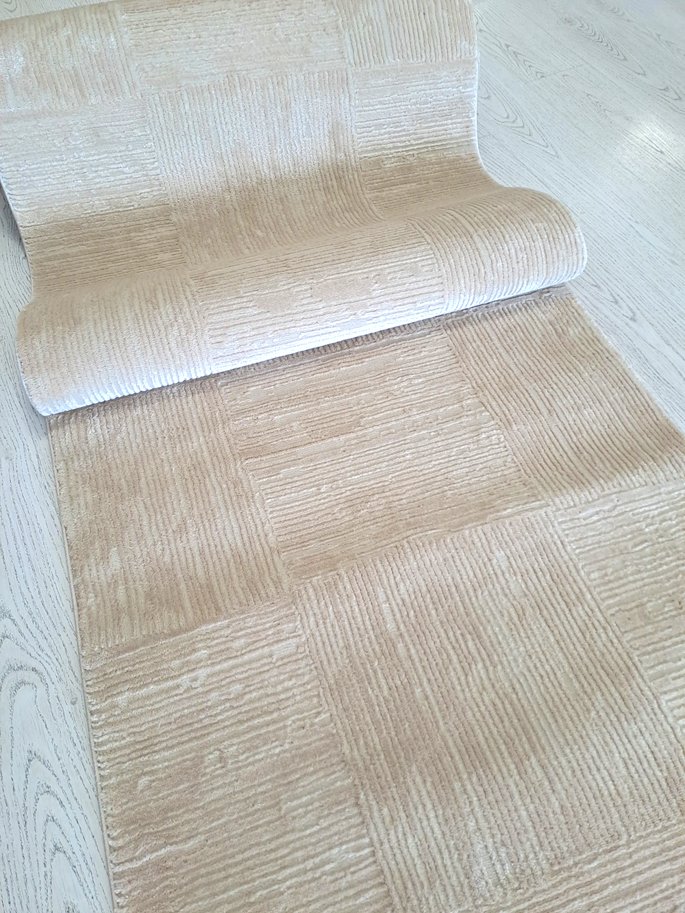 Este o traversă covor la metru pe fond bej cu pătrate texturate în relief.