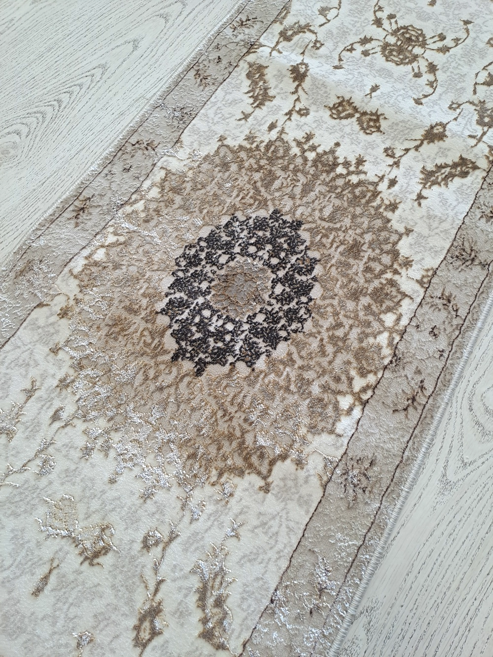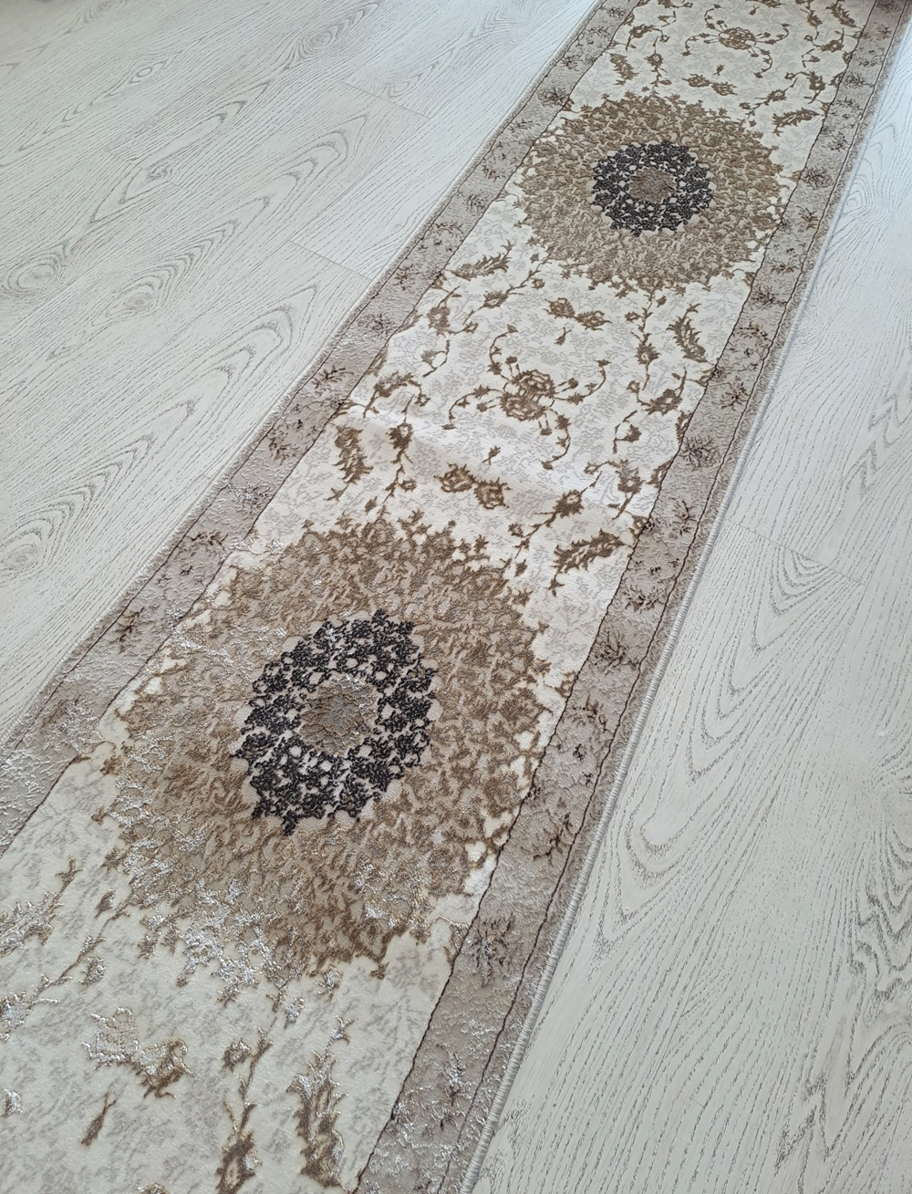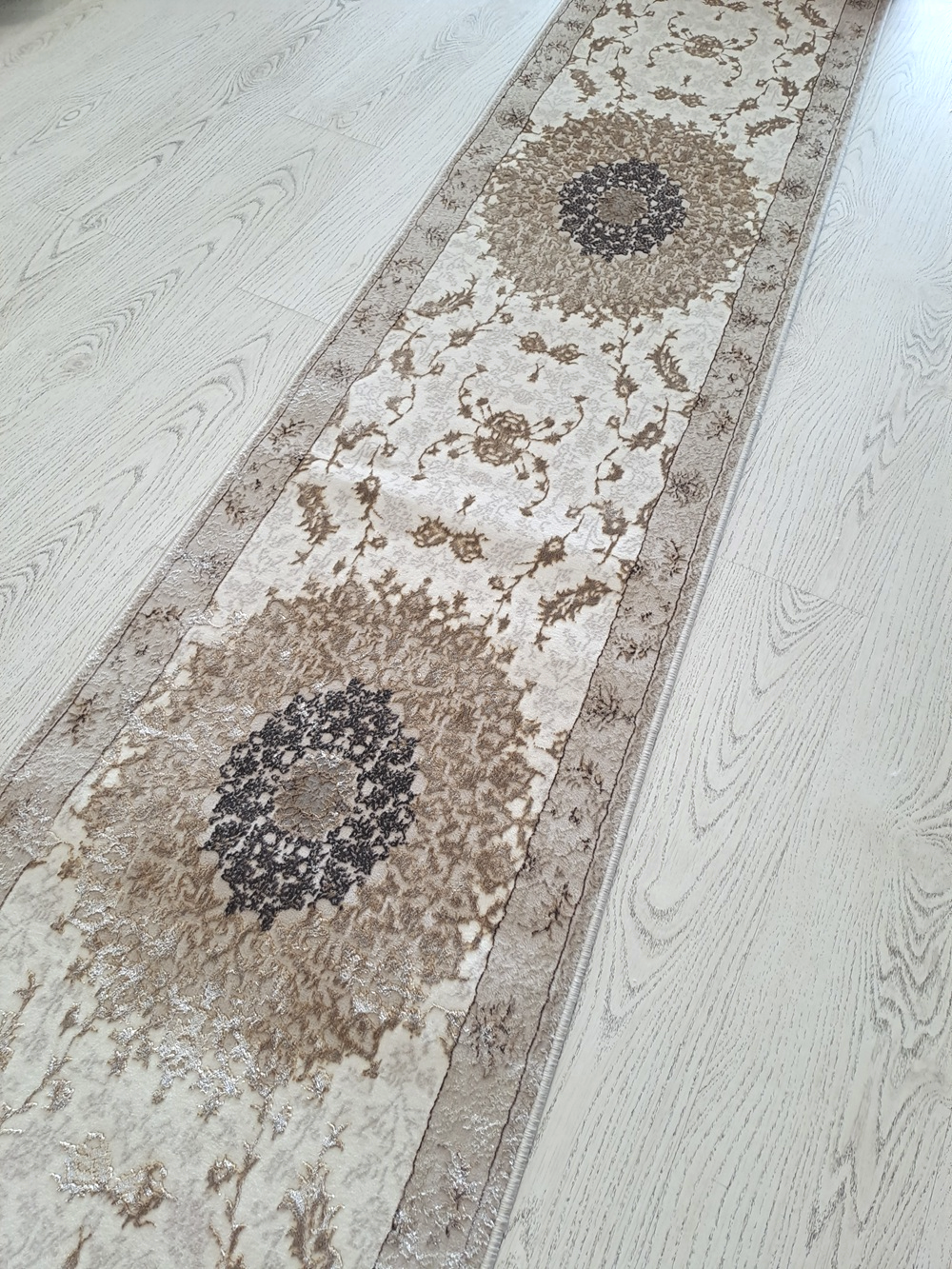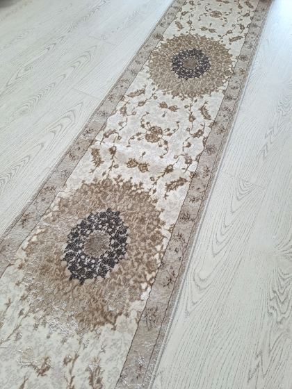 Este un covor care se vinde la metru liniar ivoar cu medalioane clasice bej.