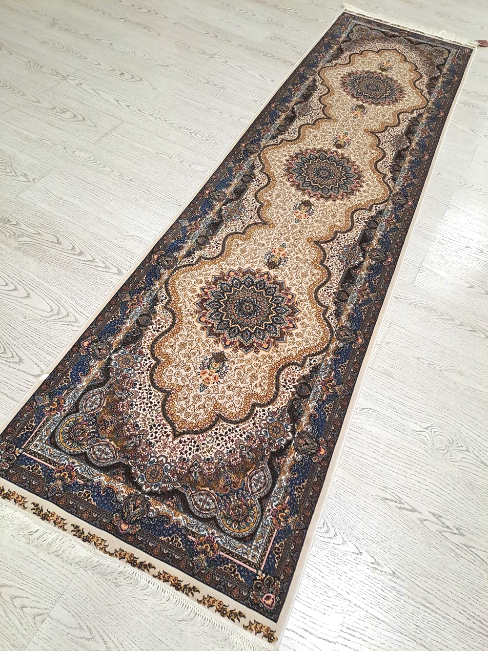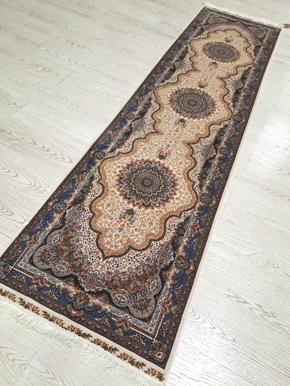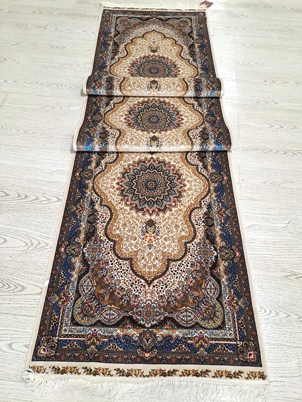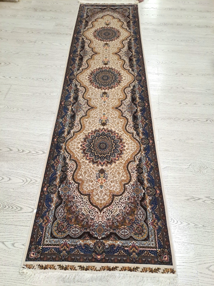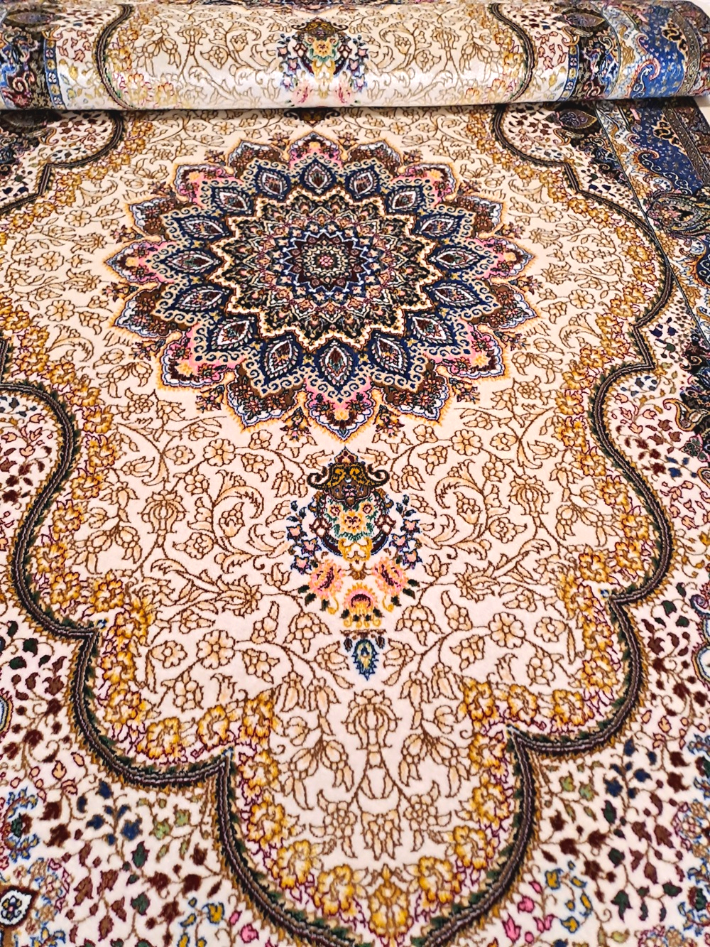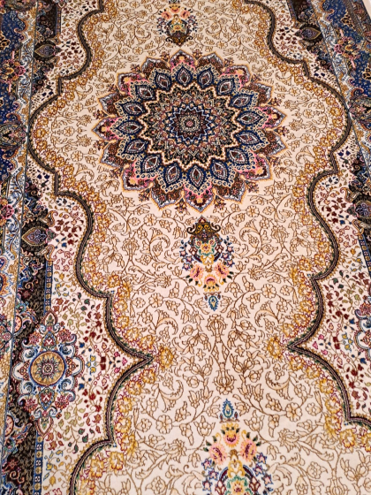 Este un covor din mătase pe fond ivoar cu model floral bej auriu mărunt. Pe mijloc are rozetă clasică.