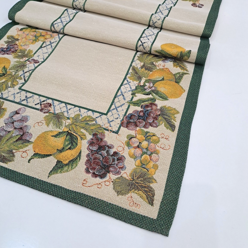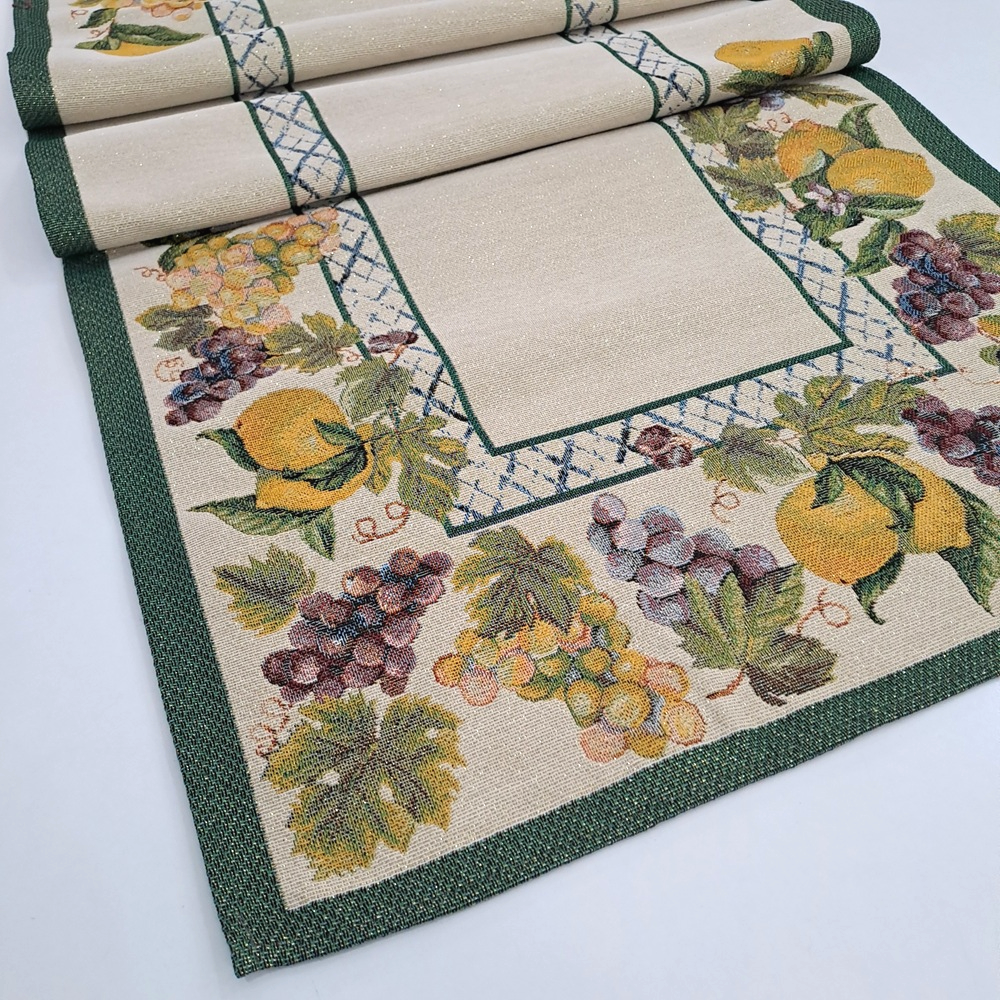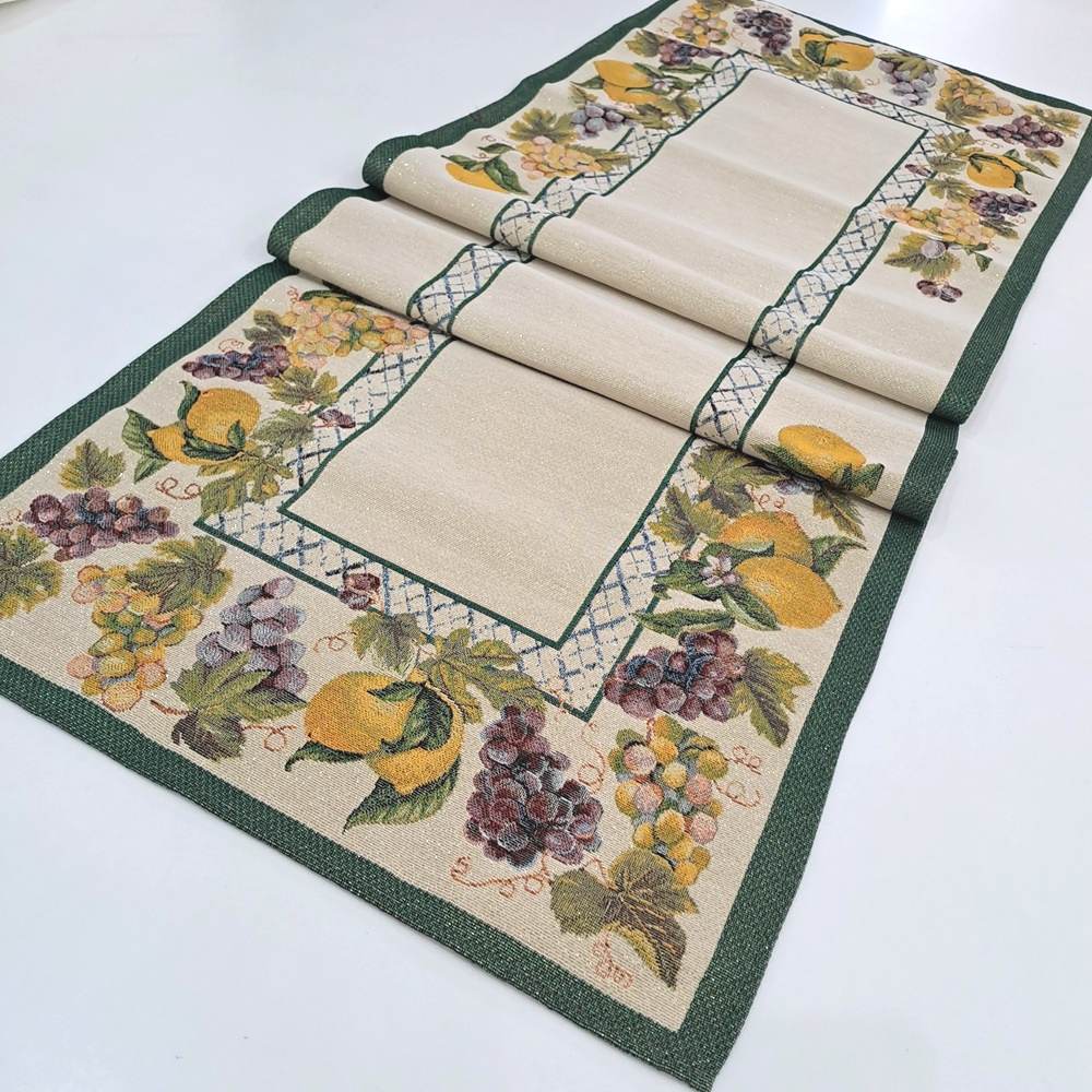 Este o traversă din țesătură tip goblen crem cu lîmâi și struguri în chenar verde.