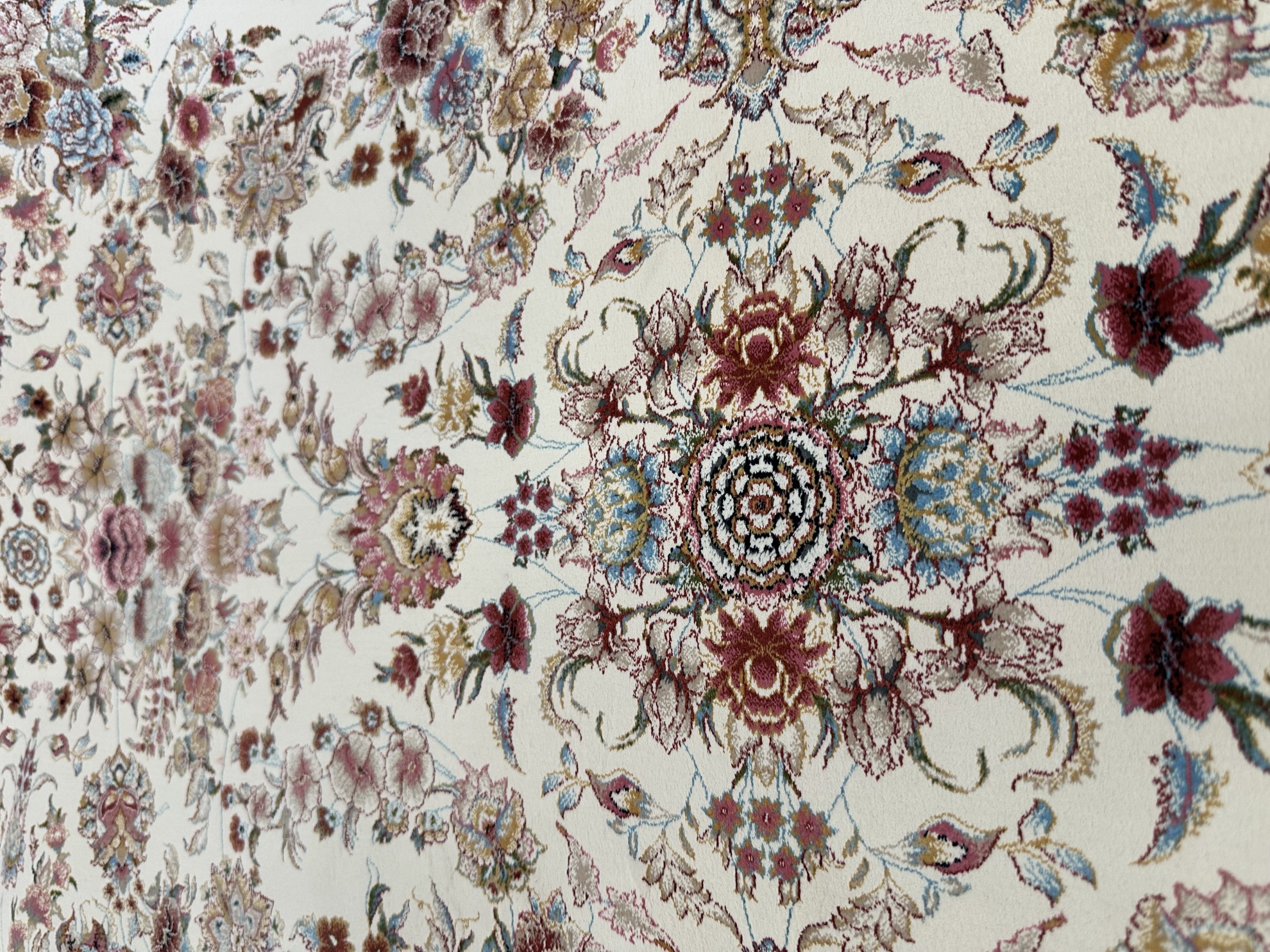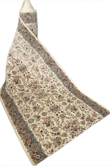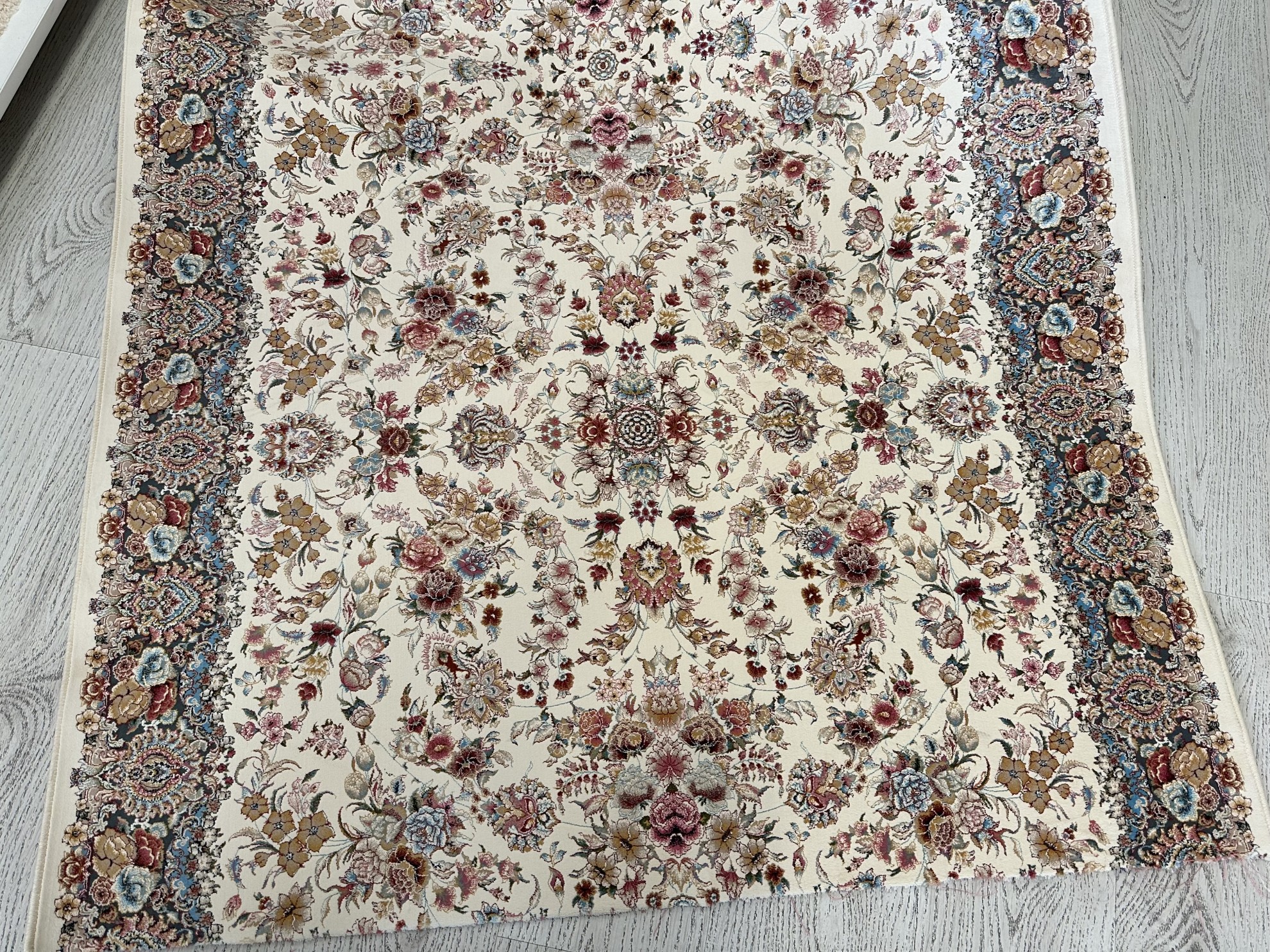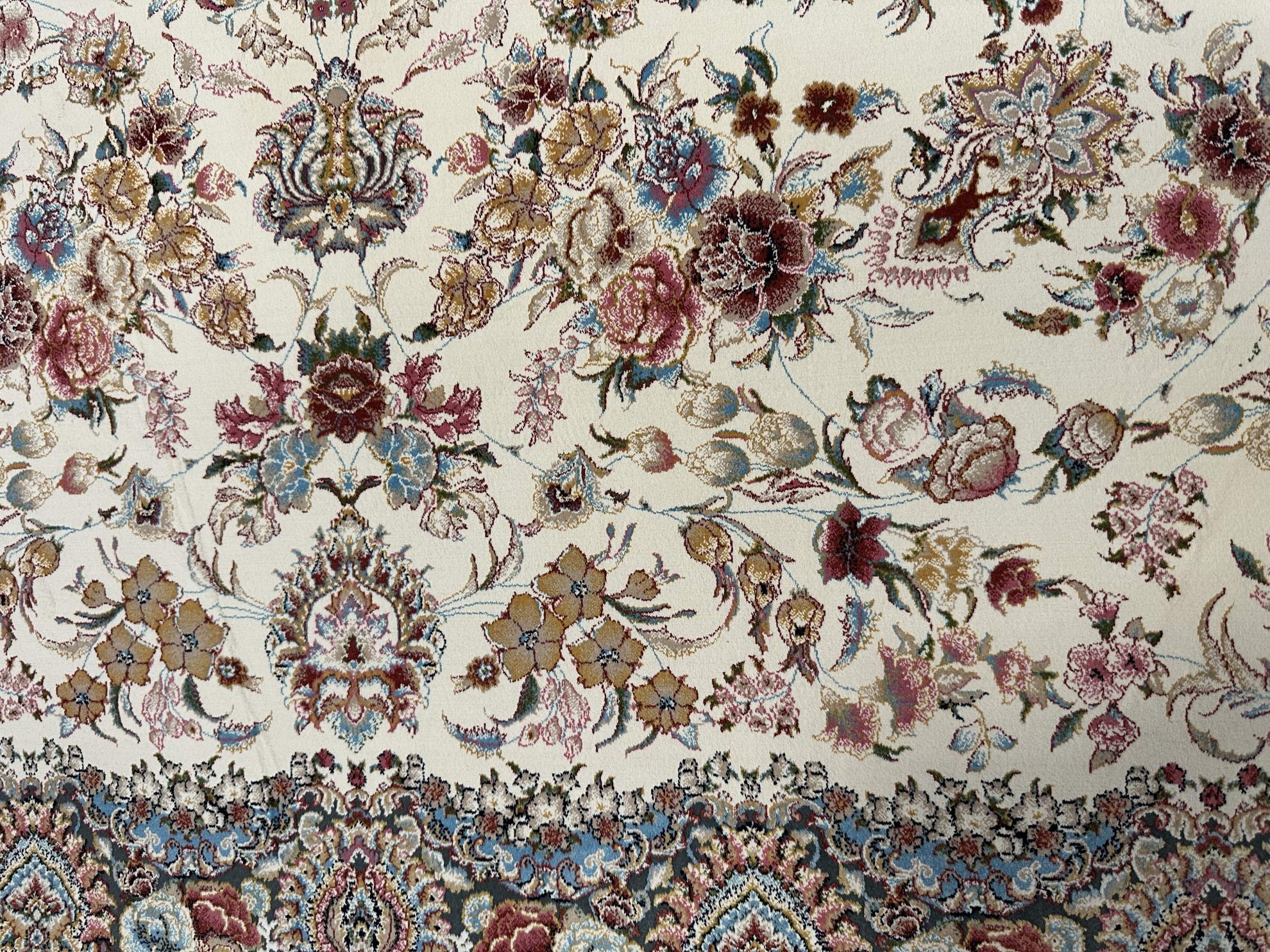 Este un covor crem cu model floral colorat încadrat în borduri florale pe fond gri.