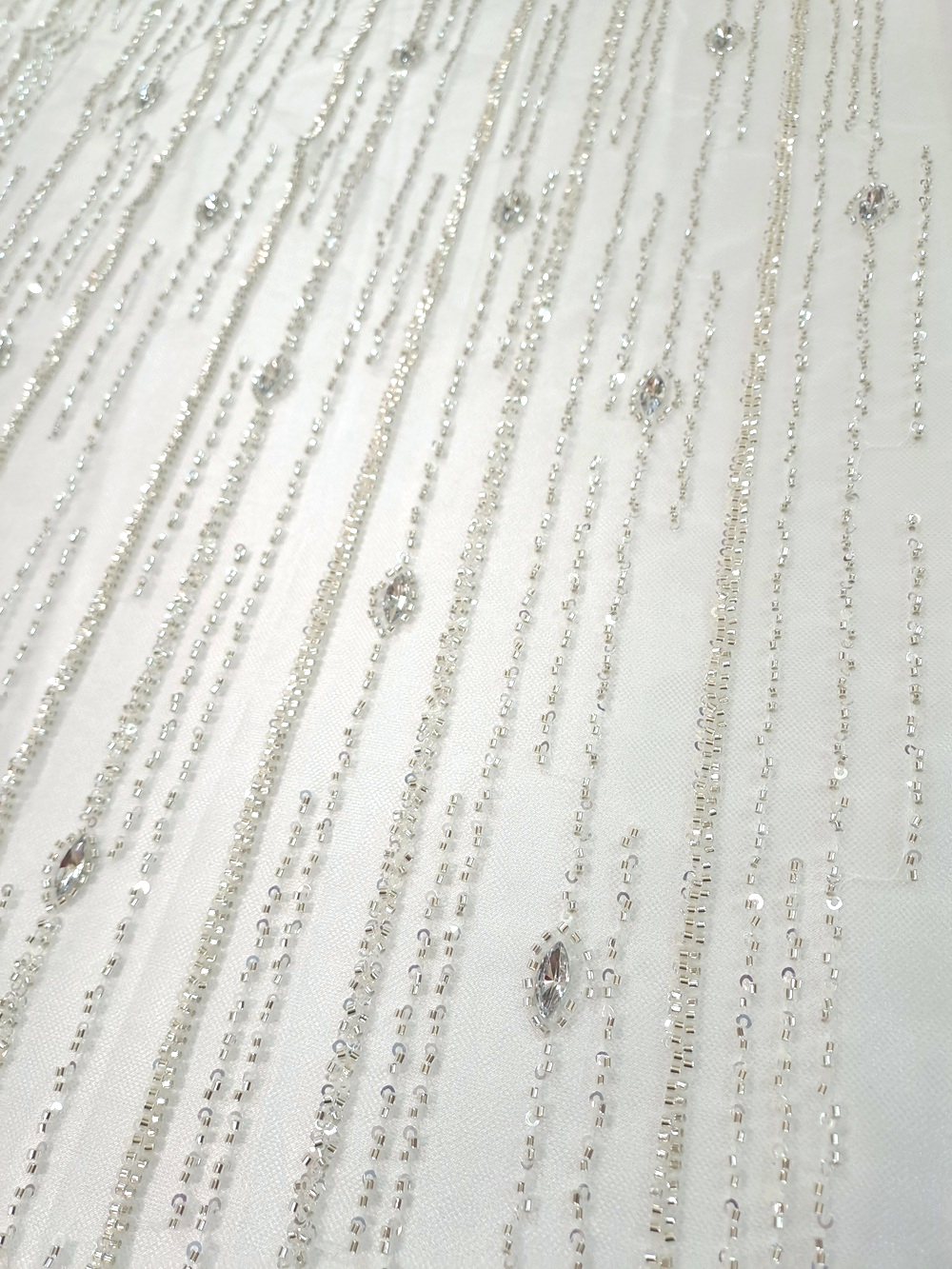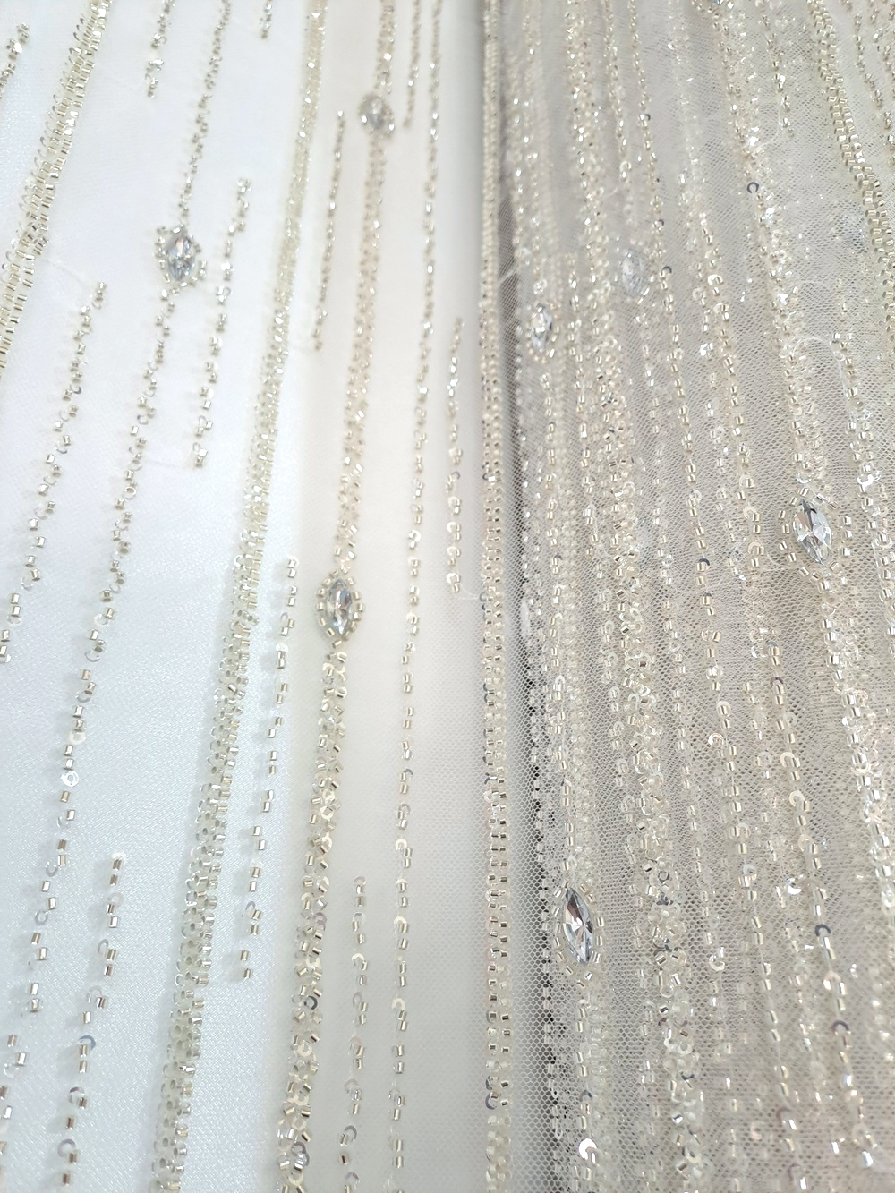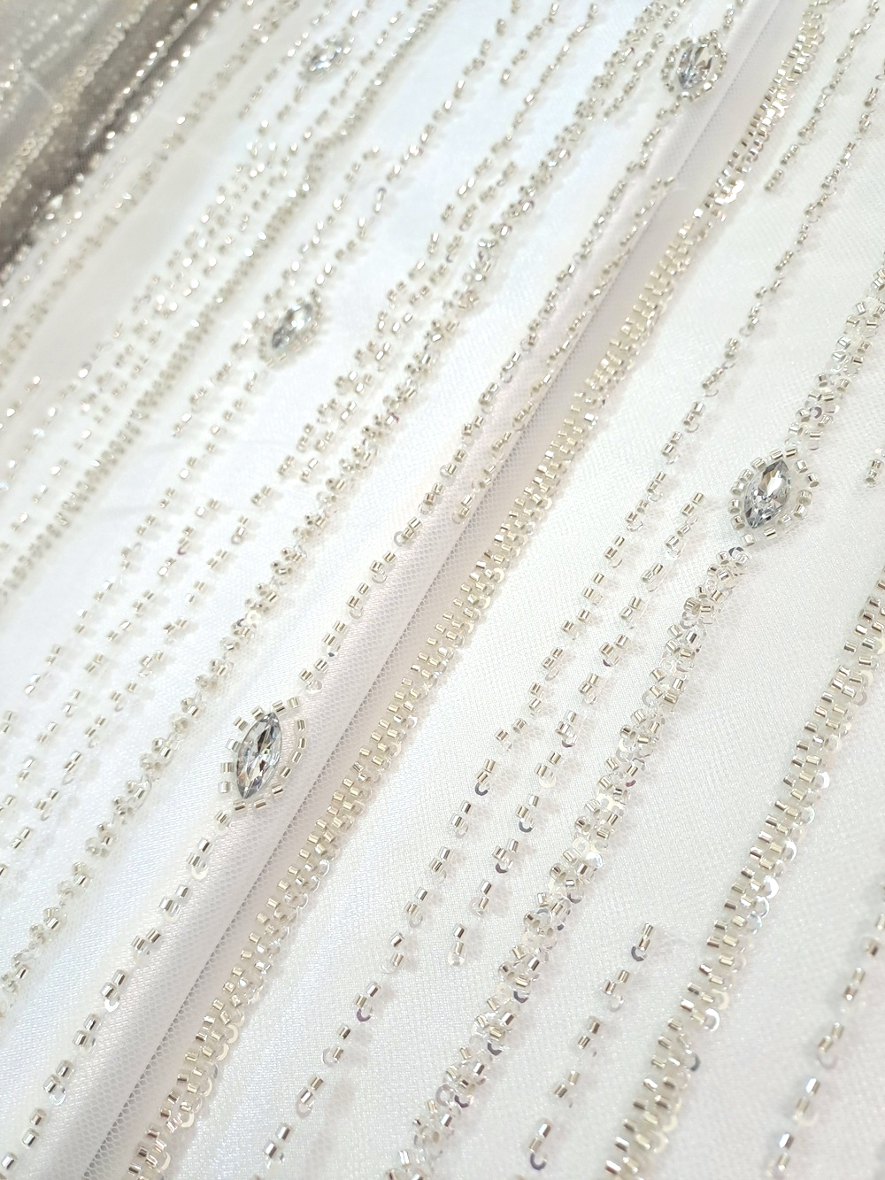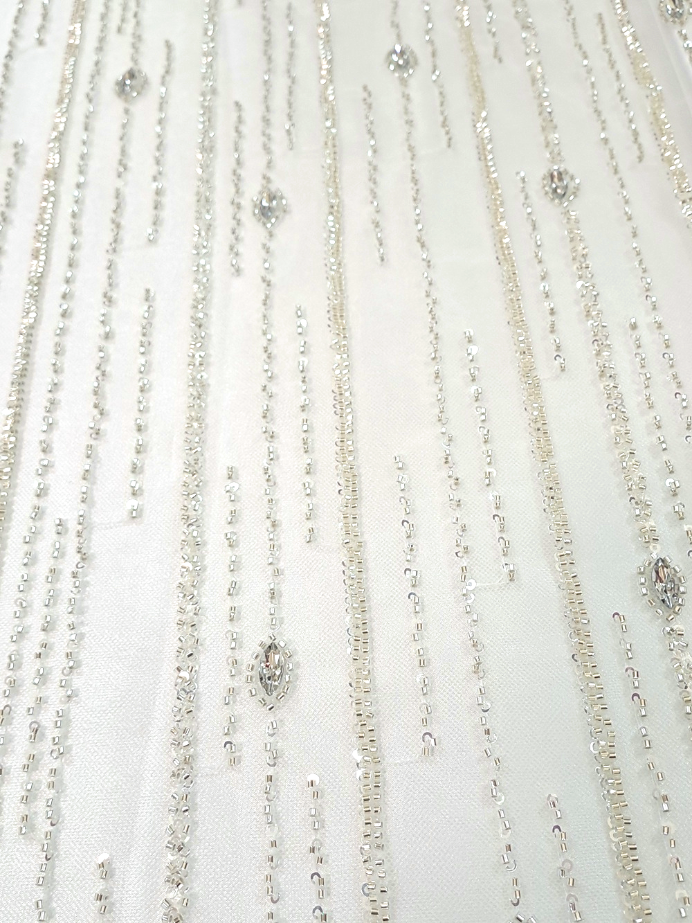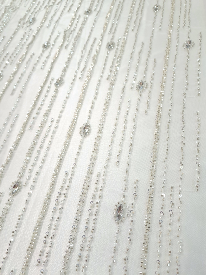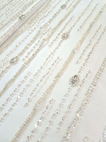 Tull mov ivoar cu cristale și mărgele argintii dispuse vertical pe lățimea materialului.